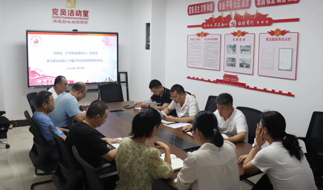 2024年7月19日,科研处(产学研发展中心)党支部在行政楼340会议室召开学习贯彻党的二十届三中全会精神专题会议。会议由高智席同志主持,科研处、产学研发展中心全体职工参加会议。
