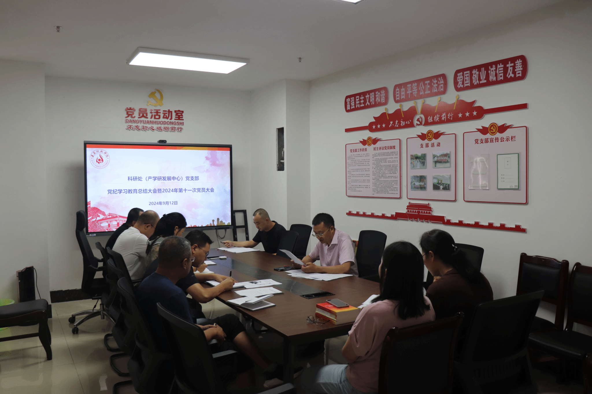2024年9月12日,科研处(产学研发展中心)党支部在行政楼340会议室召开党纪学习总结大会2024年第十一次党员大会。会议由高智席同志主持,科研处、产学研发展中心全体职工参加会议。