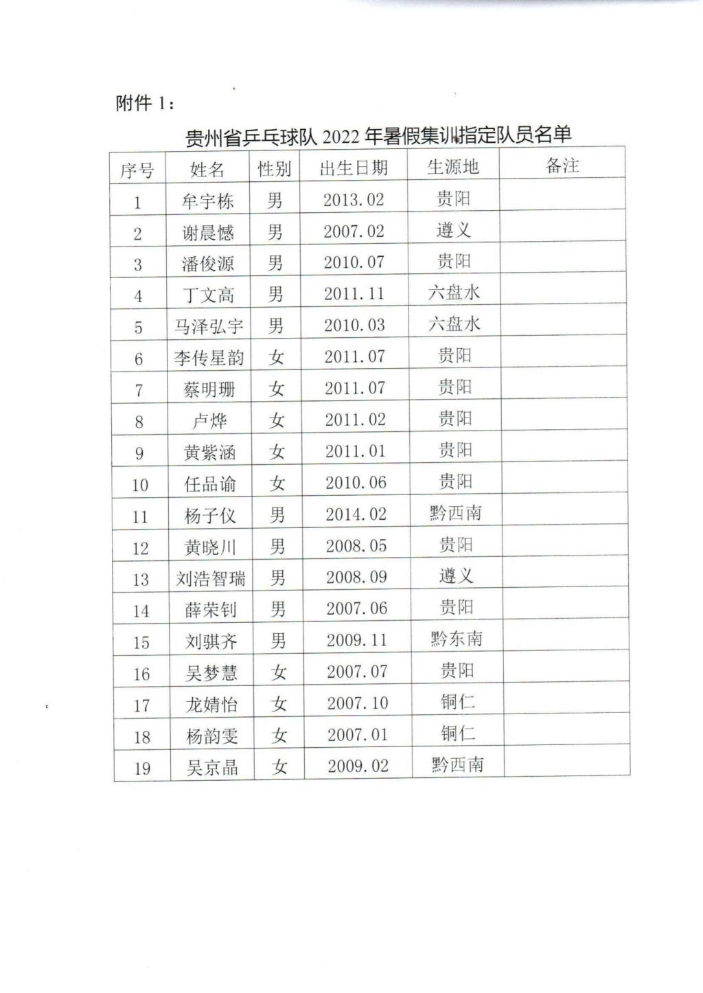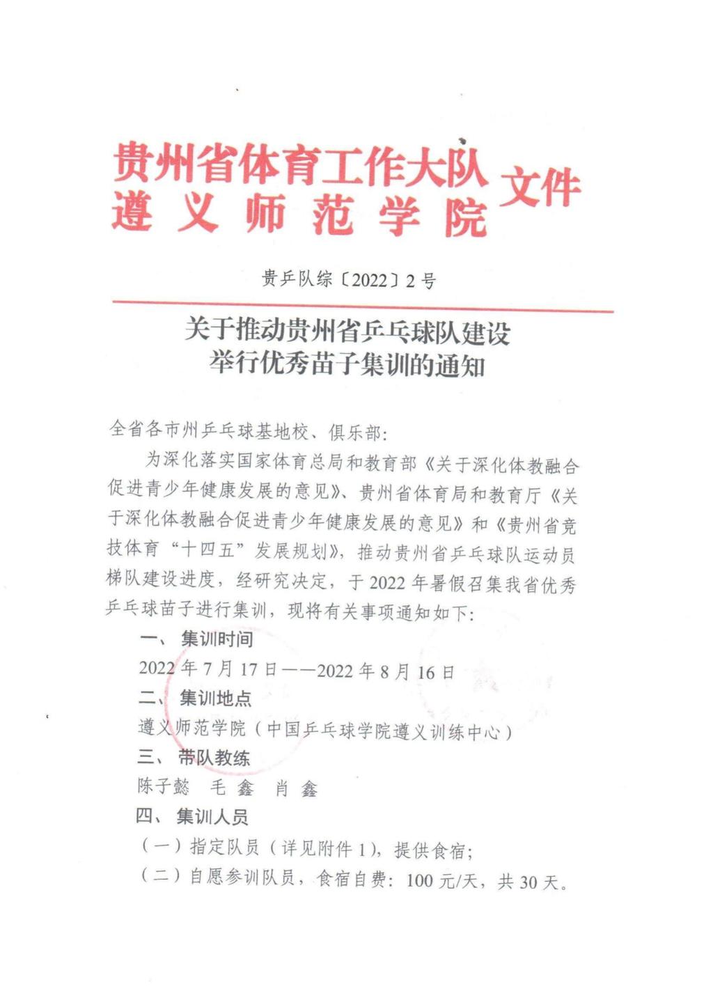 关于推动贵州省乒乓球队建设举行优秀苗子集训的通知