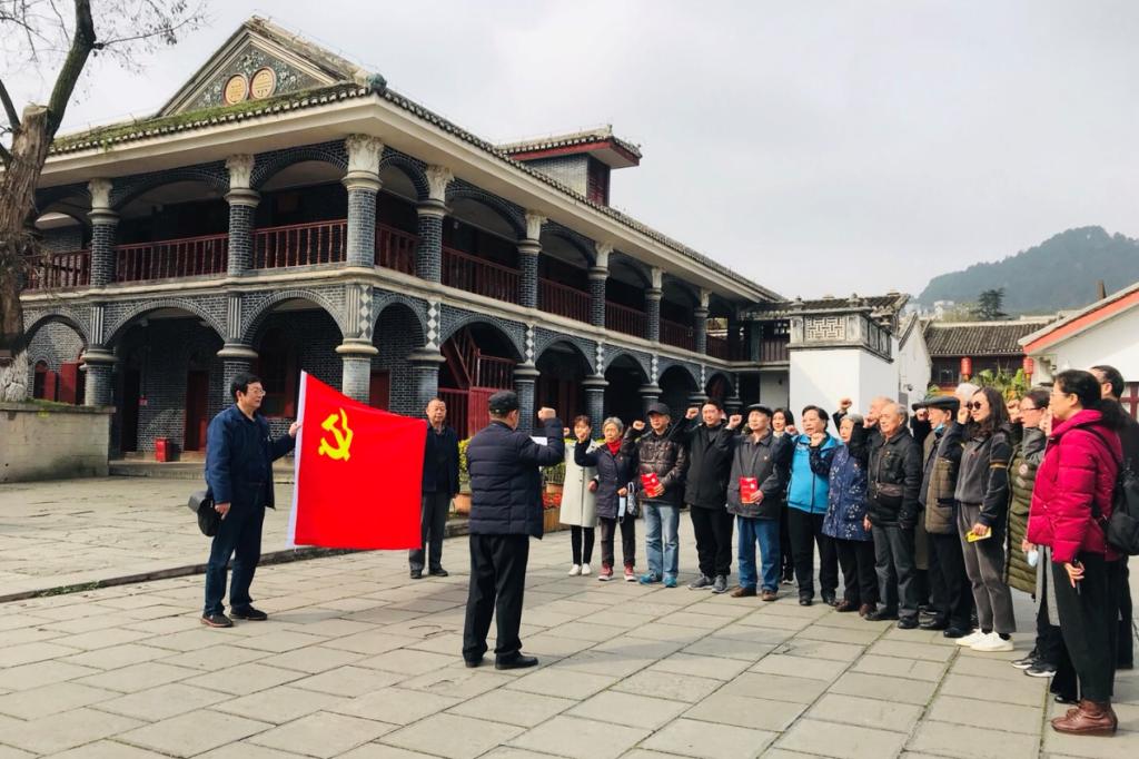 “我志愿加入中国共产党,拥护党的纲领,遵守党的章程……”在会址楼前,鲜红的党旗下,全体党员举起右拳,跟着领誓人,重温入党誓词。