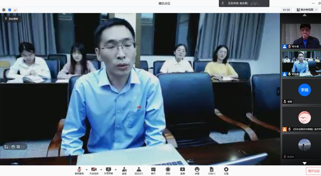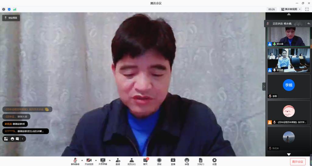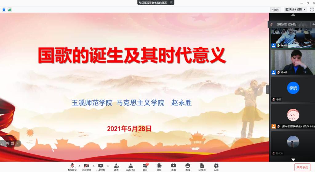 5月28日晚,“百年征程·百年辉煌”建党100周年系列学术讲座第六讲开讲,玉溪师范学院马克思主义学院院长、聂耳和国歌研究院常务副院长赵永胜受邀担任主讲嘉宾。beat365亚洲版官网长征文化研究院院长杨永福主持讲座,玉溪师范学院聂耳和国歌爱国主义教育基地宣讲团学生代表,beat365亚洲版官网历史文化与旅游学院学生代表在线上收看讲座。