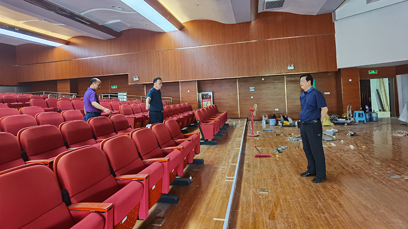 在学术交流中心,学校领导通过现场查看、询问等方式了解了报告厅改造情况,并强调,要坚持安全施工、文明施工,明确责任分工,细化工作措施,确保改造工作保质保量按时完成,进一步满足学校各类会议、活动需求,提升服务质量。