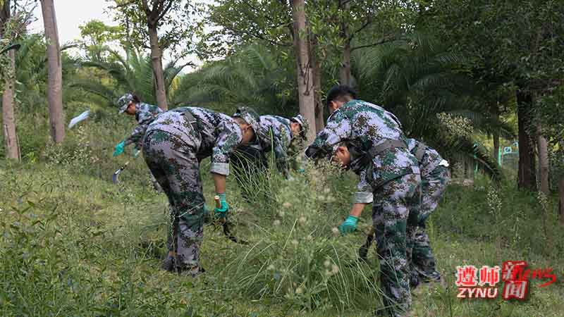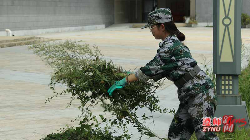 活动中,2021级新生以连为单位,由连队教官带队,按照划分的劳动区域,分批领取劳动工具,并有序开展劳动实践。同学们在烈日下浑汗如雨、干劲十足,在蔓草丛中一同协作努力,将校园逐渐整理干净。
