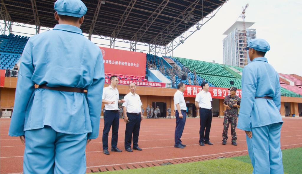 9月16日上午,学校党委书记张波、校长刘肇军、副校长曾伯平来到西区运动场,看望慰问2021级参训学生。
