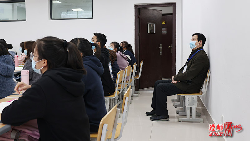 在执文楼,张波随机走进教室,对“普通话与教师口语”“中国政治制度史”“秘书学”“秘书实务”“语言学概论”等课程进行听课看课,了解二级学院教学秩序、教师讲课、学生到课、教学设备运行、疫情防控等情况。