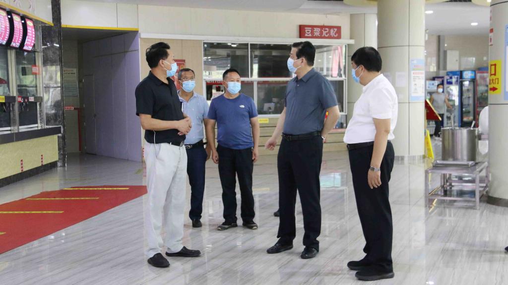食堂是疫情防控重点场所。张波与食堂工作人员进行了交流,了解他们对疫情防控措施的掌握程度,并实地查看了指引标识张贴、进出路线设置等情况。他指出,食堂是人员相对聚集的场所,必须严格核验人员身份,采取分时错峰就餐,做好引导和提醒工作,避免人员扎堆。