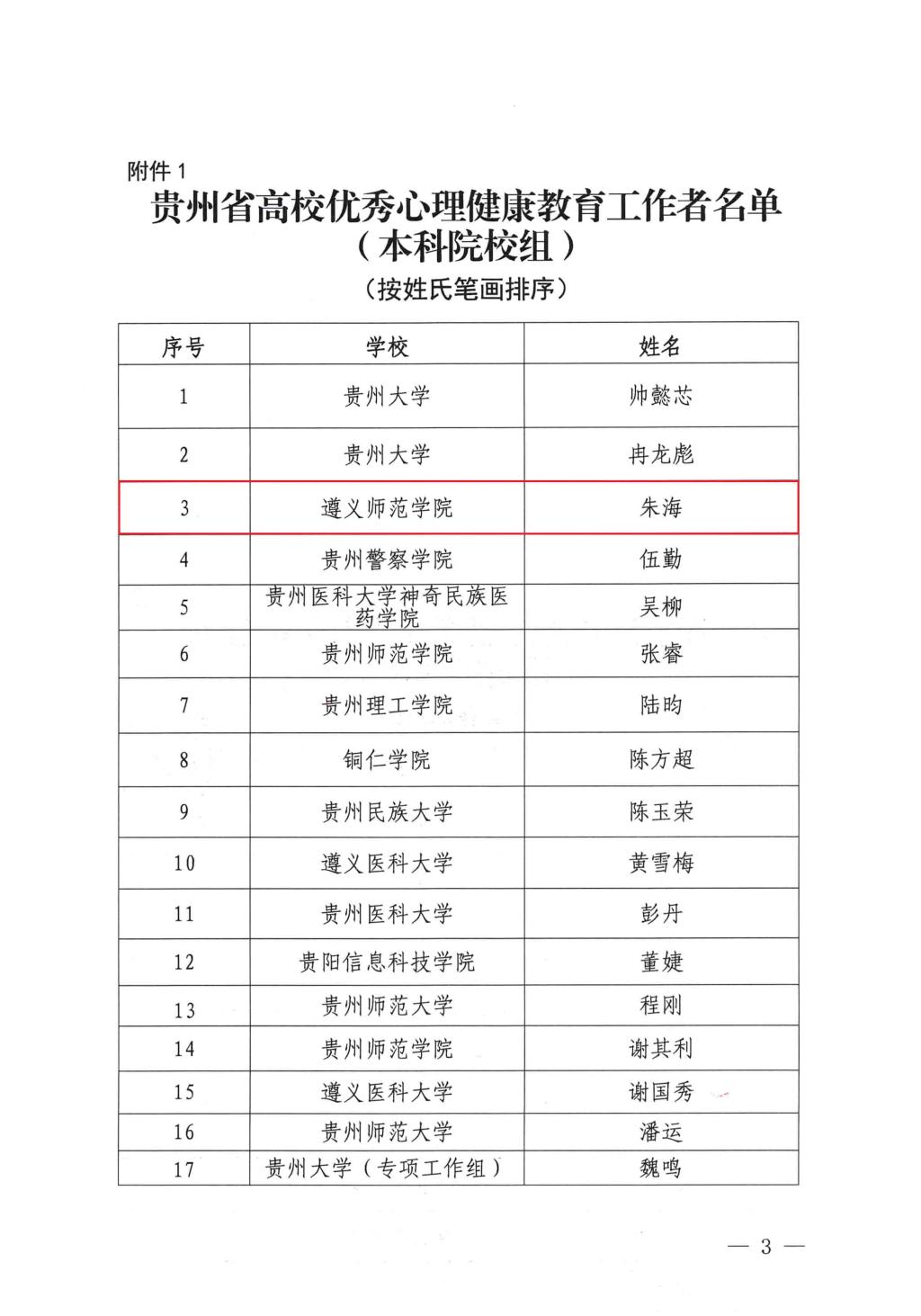 近日,省教育厅公布2022年度贵州省高校优秀心理健康教育工作者评选结果。经学校推荐、专家评审、结果公示,beat365亚洲版官网教师教育学院院长、教授朱海获评“贵州省高校优秀心理健康教育工作者”。