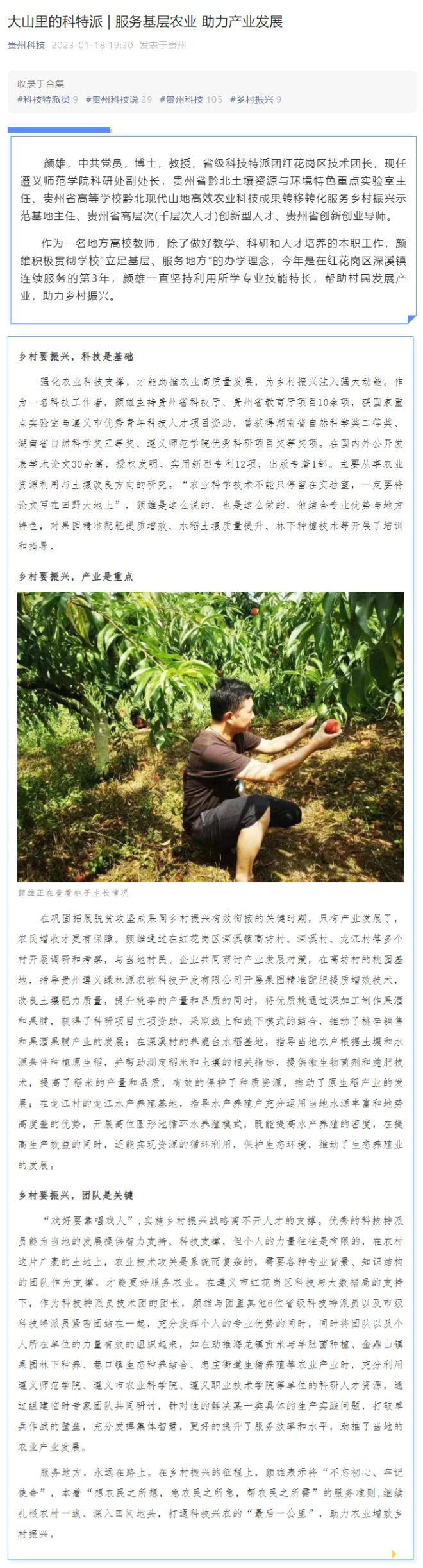 1月18日,贵州省科技厅官微以《大山里的科特派 | 服务基层农业 助力产业发展》为题,对beat365亚洲版官网科研处副处长、省级科技特派团红花岗区技术团长颜雄进行了报道。
