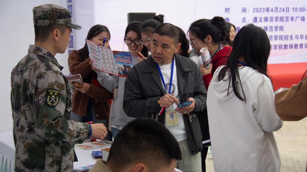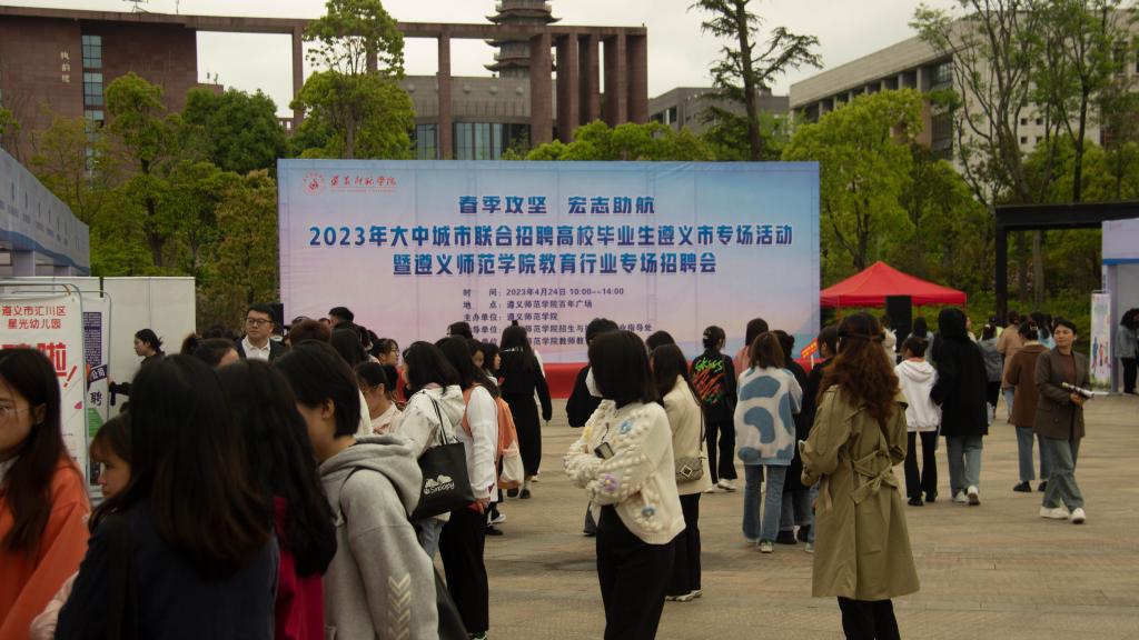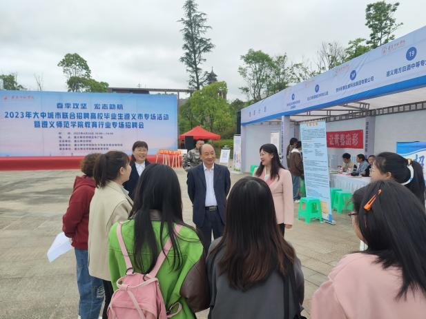 为精准帮助毕业生就业,4月24日上午,“春季攻坚 宏志助航”2023年大中城市联合招聘高校毕业生遵义市专场活动暨beat365亚洲版官网教育行业专场招聘会在beat365百年广场举行。校长刘肇军、党委副书记曾伯平亲临现场指导,招生与毕业生就业指导处主要负责人,教师教育学院党政班子,各二级学院师生代表,教师教育学院学生科负责同志、毕业班班主任等参加启动仪式。