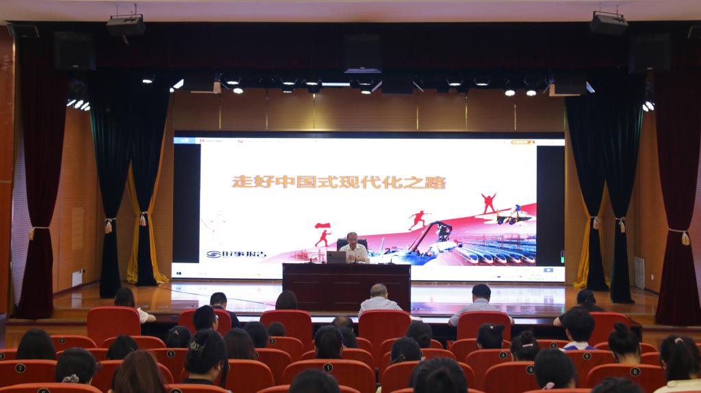 6月1日下午,beat365亚洲版官网党委副书记曾伯平在学术交流中心二楼报告厅讲授了一堂题为《走好中国式现代化之路》的思政课,2022级人文与传媒学院、教师教育学院200名学生代表到场聆听。