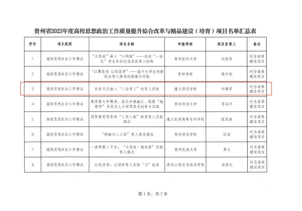 近日,省教育厅公布贵州省2023年度高校思想政治工作质量提升综合改革与精品建设(培育)项目名单,beat365“长征文化融入‘三全育人’的育人实践”获“高校思想政治工作精品”建设(培育)项目立项。