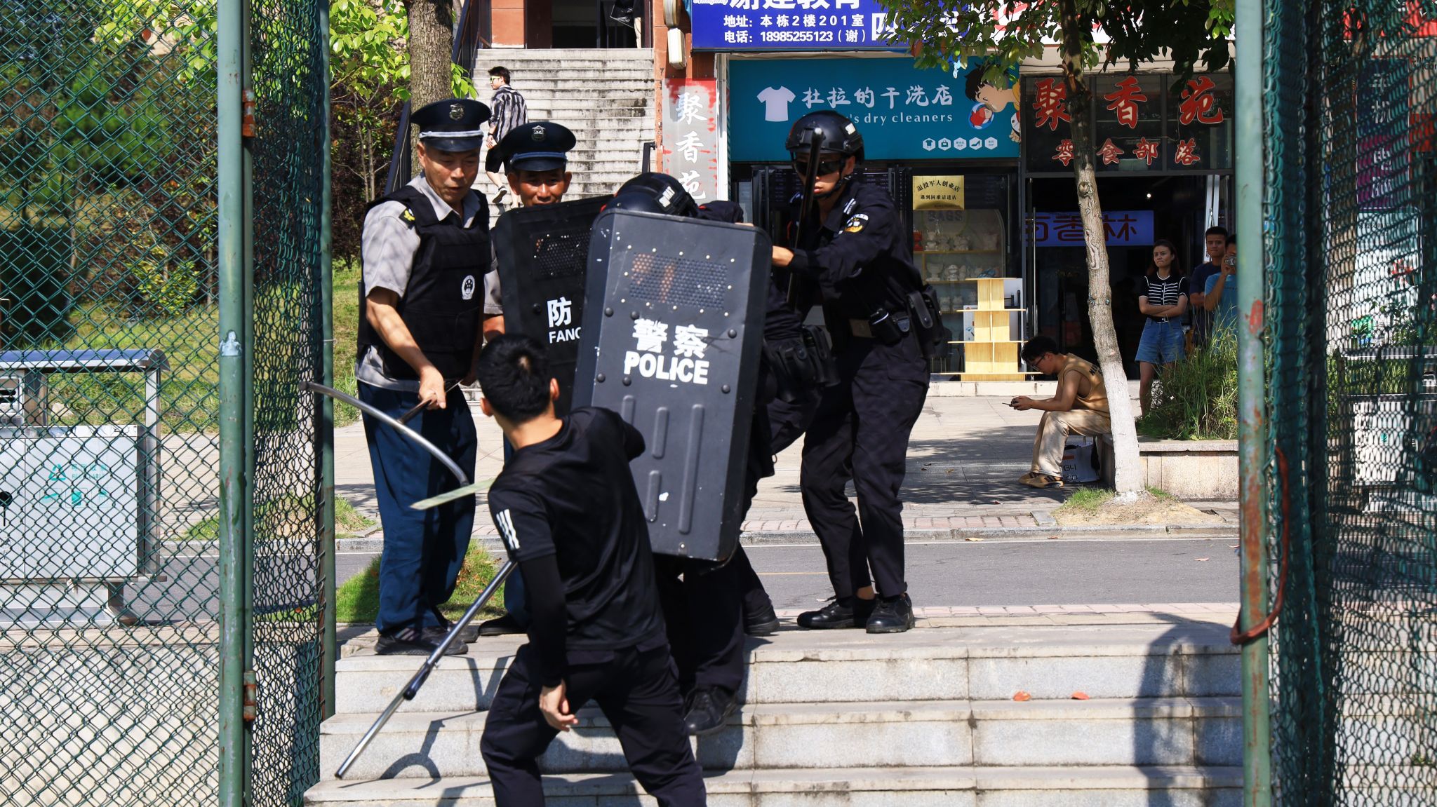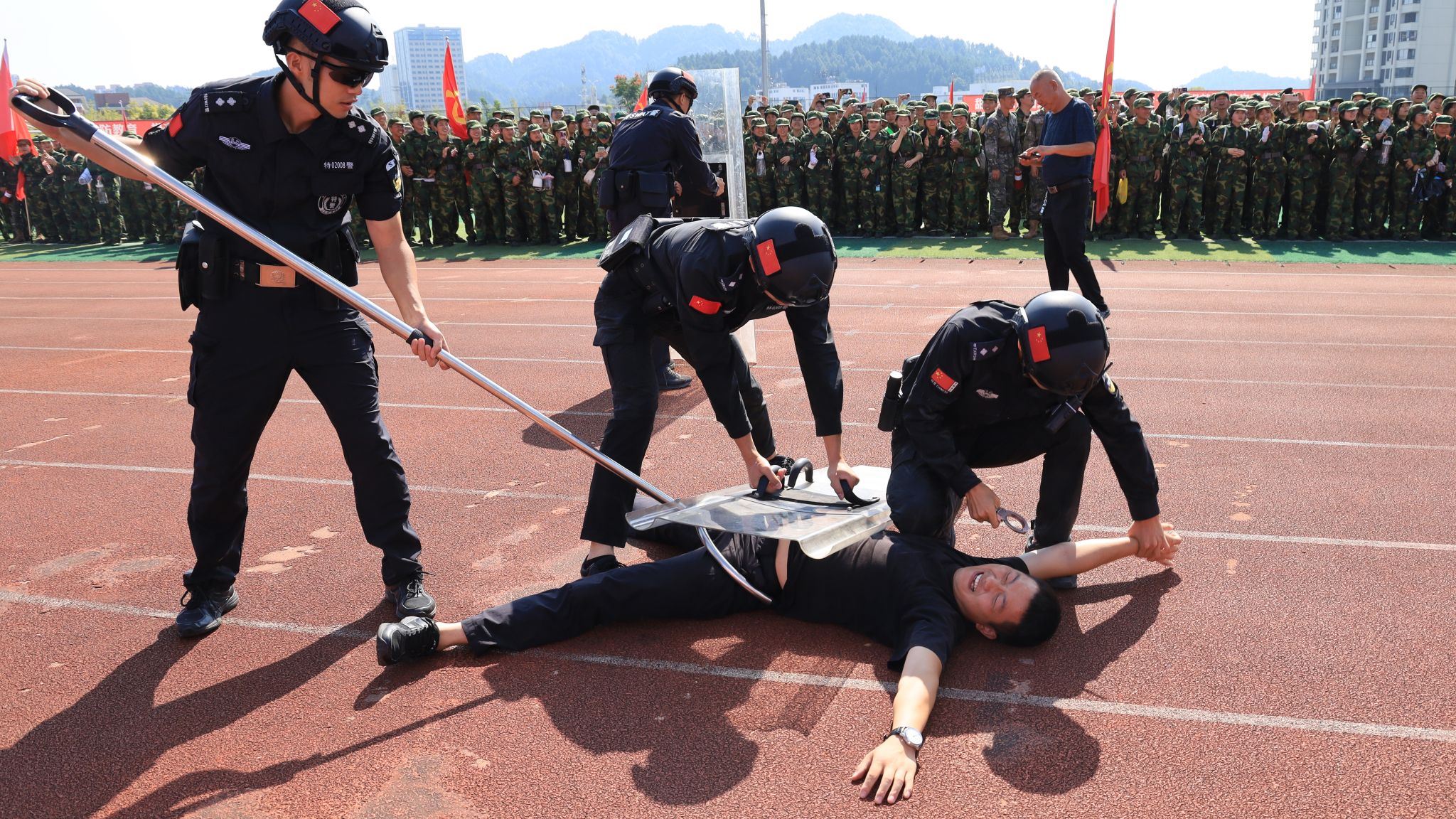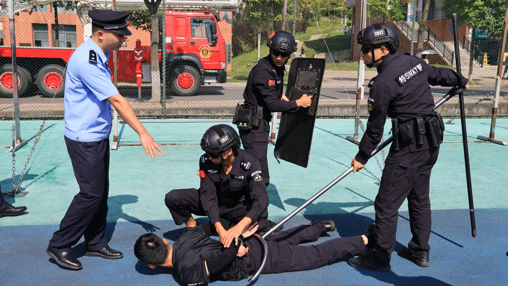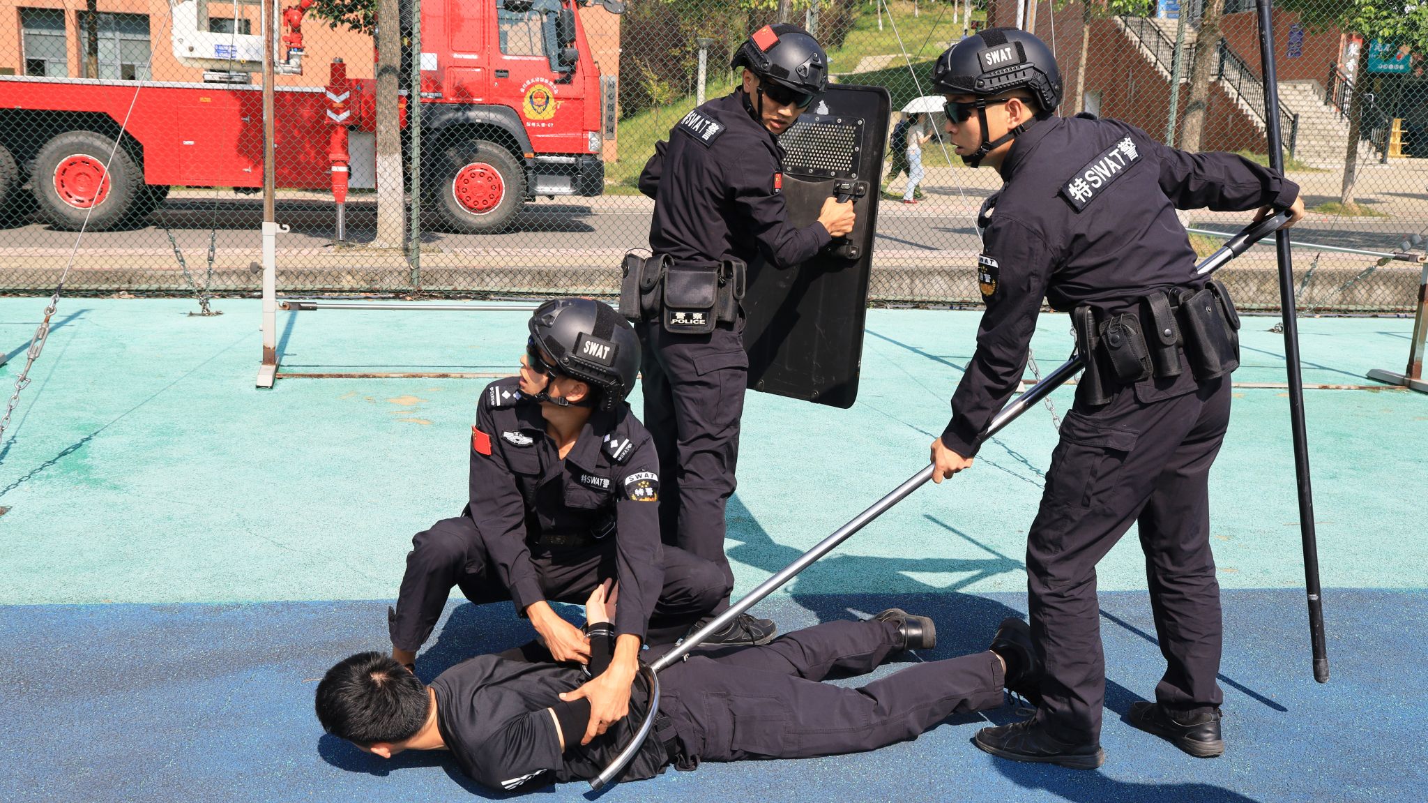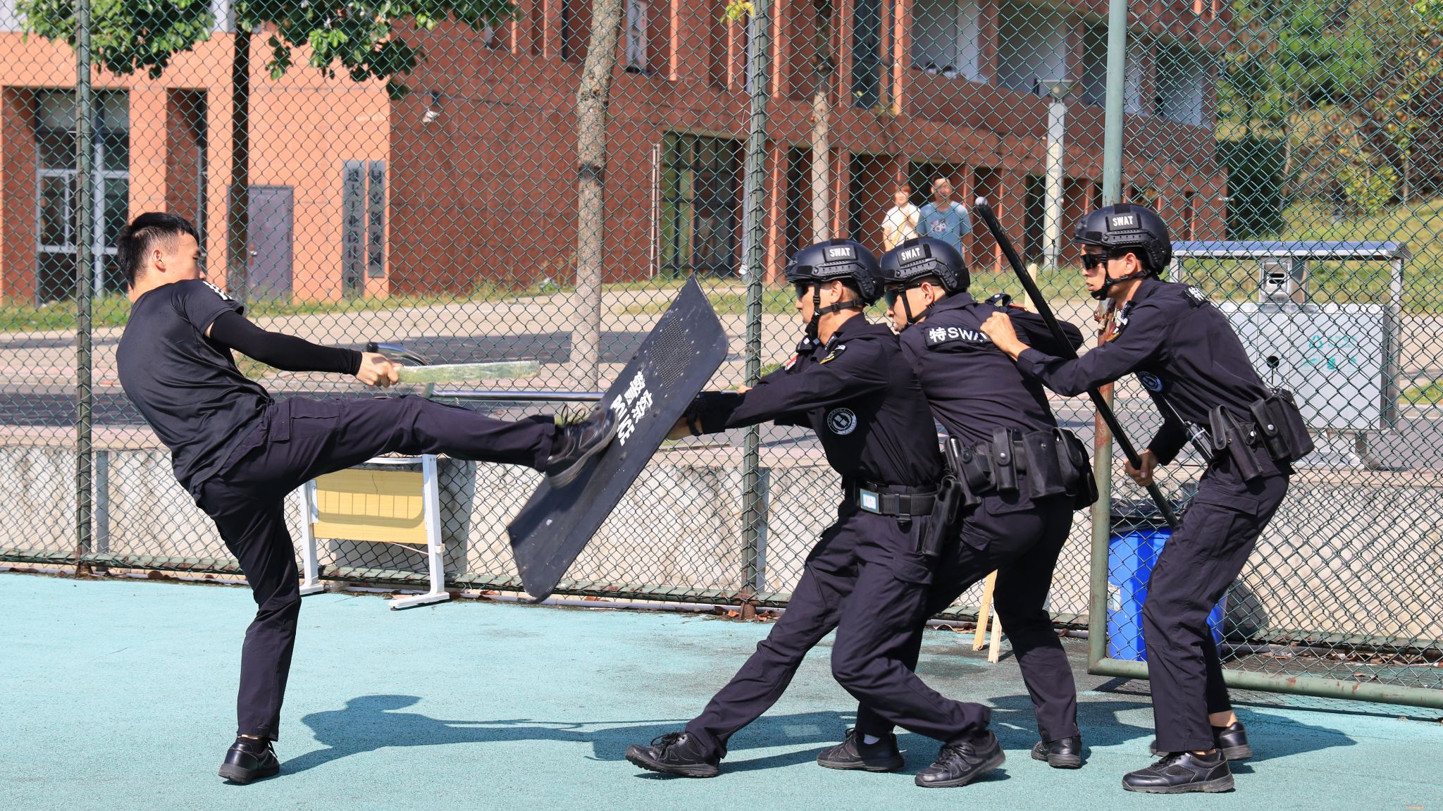 与此同时,“歹徒”手持凶器闯入南区运动场安全区域,意欲攻击学生,学校安保人员立即与其展开搏斗,市公安局新蒲分局反恐大队随即赶到,对“歹徒”进行劝导,并成功抓捕。