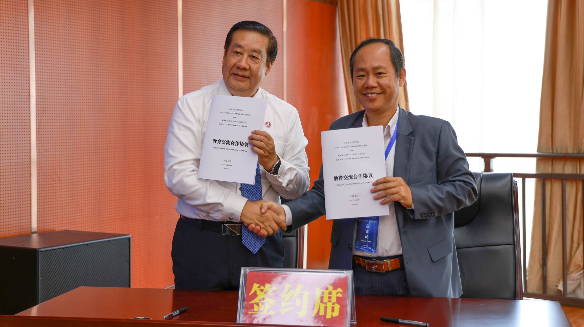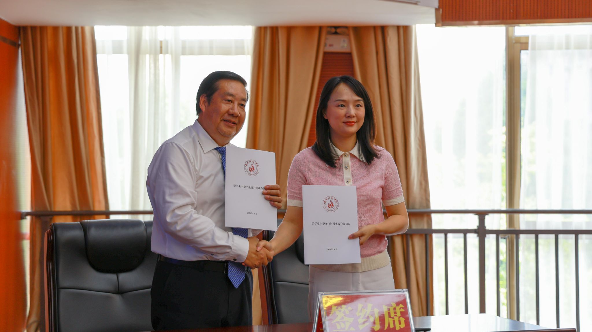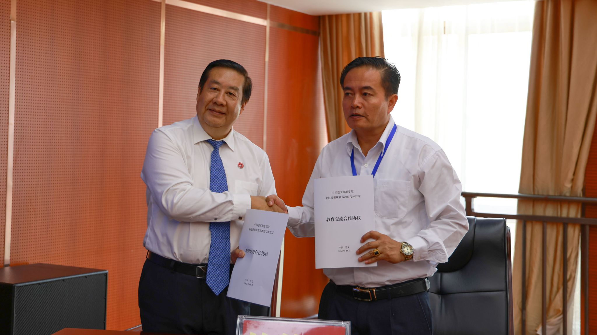 胡贵勇代表beat365亚洲版官网与遵义市文化旅游局、柬埔寨克鲁扬学校签署合作协议,并向国际青年代表授旗。按照协议,beat365将在遵义市文旅景点建立留学生研习基地,并在老挝波里坎赛省、柬埔寨克鲁扬学校建立实践实习基地,通过建立长期合作关系,探讨留学生培训模式和途径等。