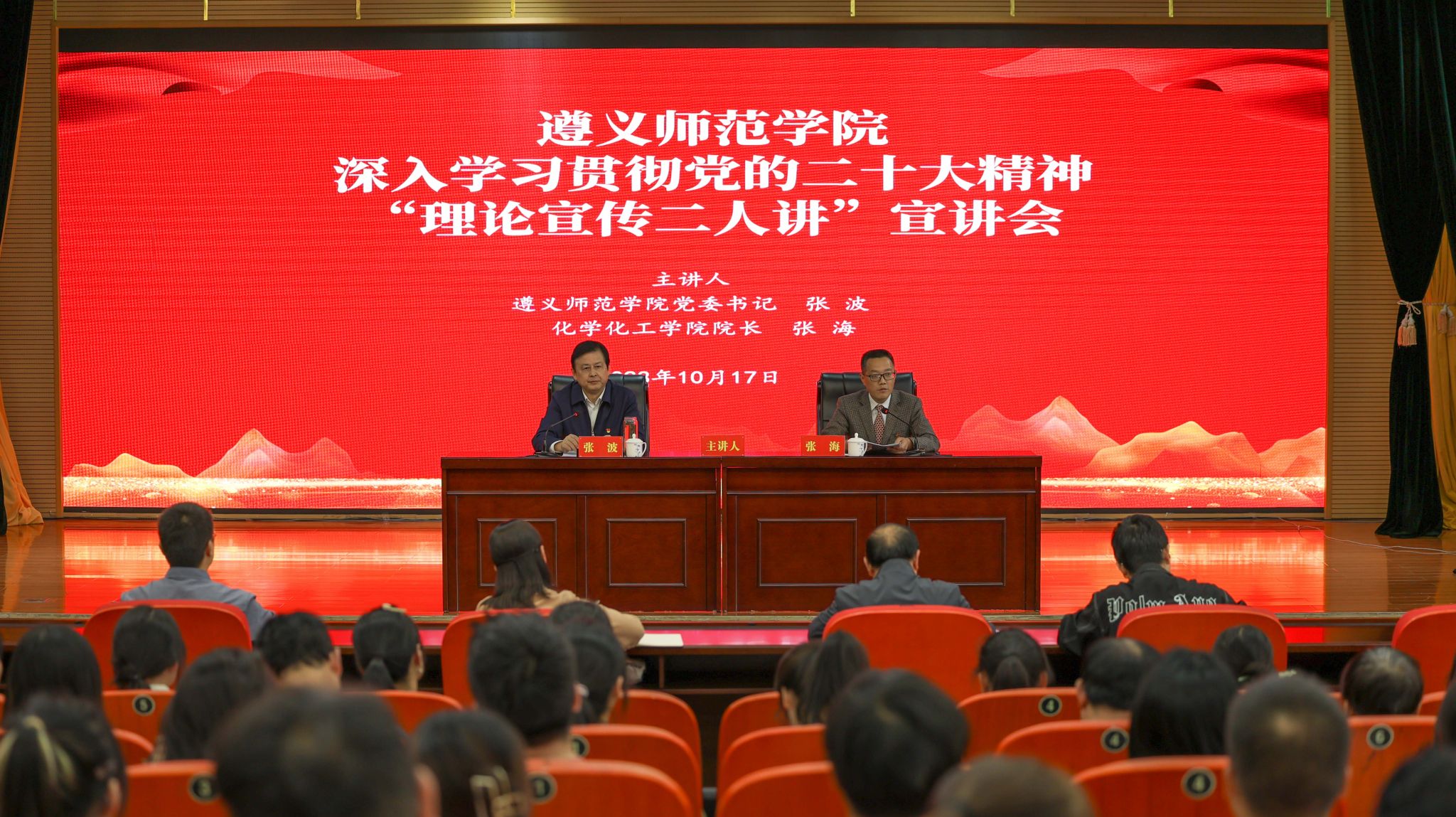 10月17日下午,beat365在学术交流中心报告厅举行党的二十大精神“理论宣传二人讲”。beat365党委书记张波,化学化工学院党总支副书记、院长张海担任主讲人。