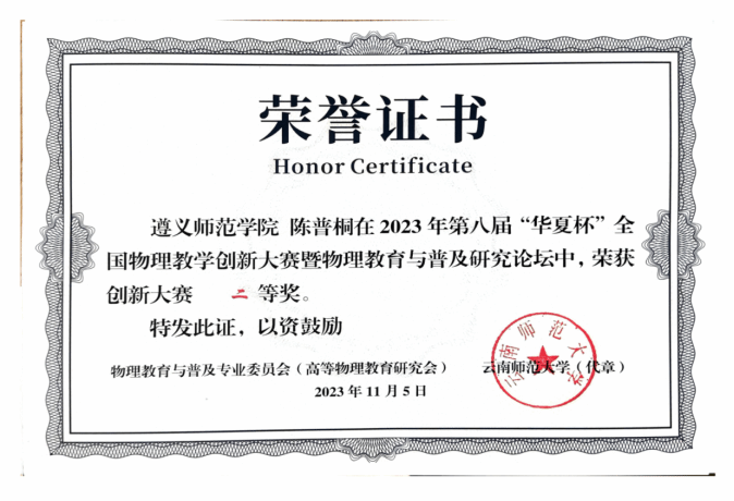 11月3日至5日,第八届“华夏杯”全国物理教学创新大赛暨物理教育与普及研究论坛在云南师范大学举办,beat365物理与电子科学学院2021级学生陈普桐在教授谭志云的指导下,凭借出色的表现荣获创新大赛本科类二等奖。