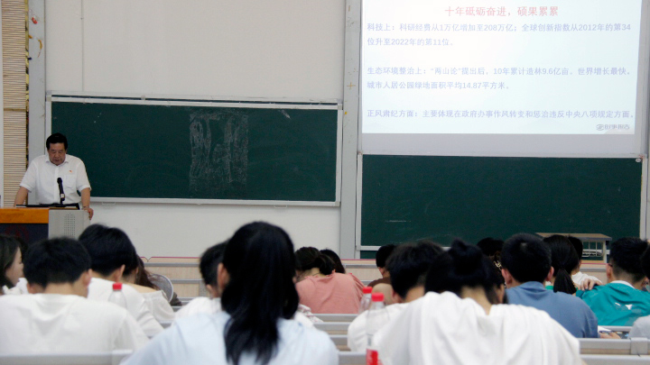 胡贵勇围绕“永载史册的伟大变革”“引领复兴的宏伟蓝图”“笃行不怠的战略定力”三个方面解读了新时代十年的伟大变革及其里程碑意义、前进道路上应对风险挑战的战略定力。他说道,10年来,改革开放和社会主义现代化建设深入推进,我国经济实力、科技实力、综合国力跃上新的大台阶,人民生活水平跃上新的大台阶。在新时代的锻造、奋斗、实践中,走过百年奋斗历程的中国共产党更加坚强有力,中国人民焕发出更为强烈的历史自觉和主动精神,我国发展实现历史性大跨越,科学社会主义在21 世纪的中国焕发出新的蓬勃生机。