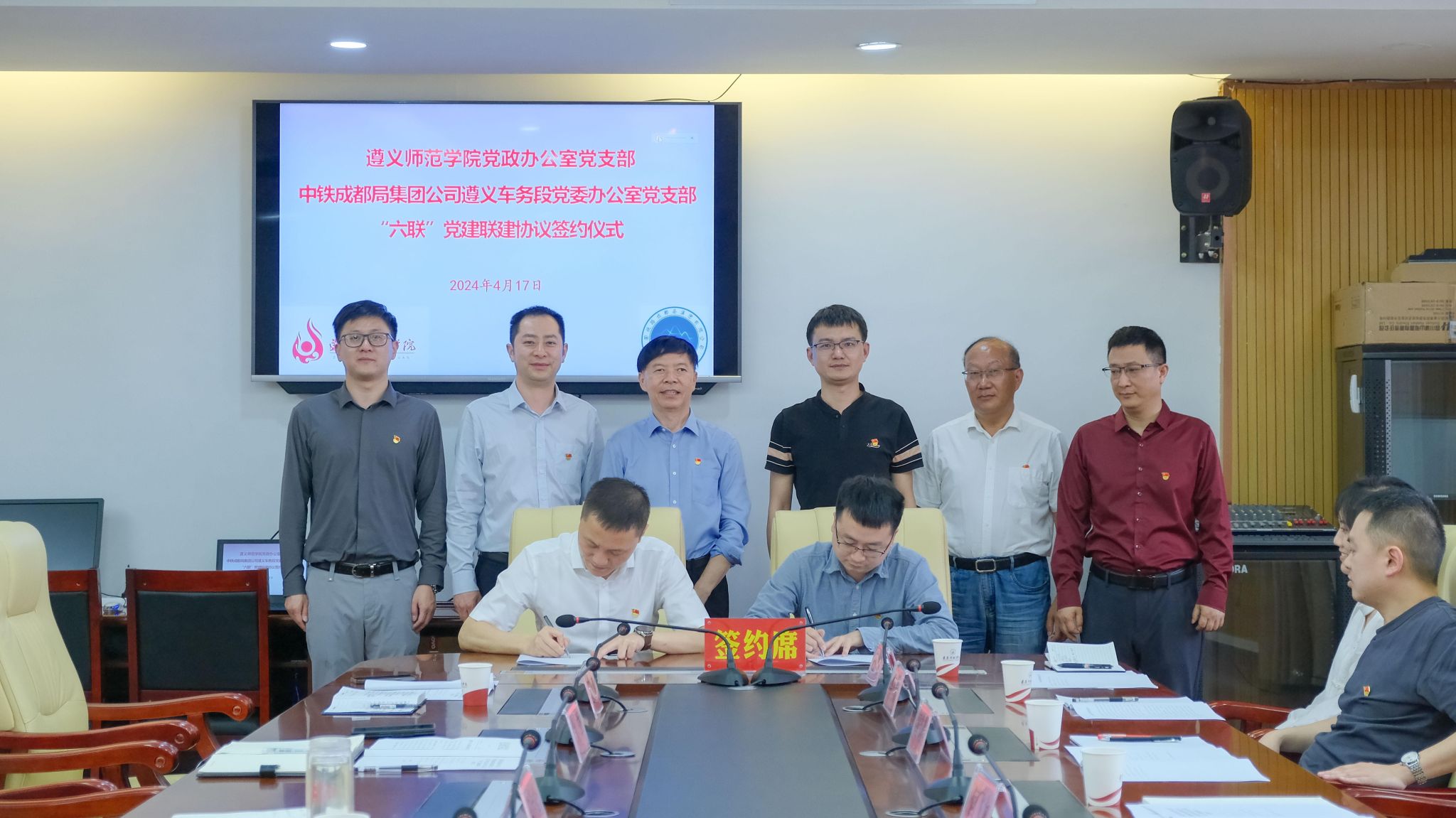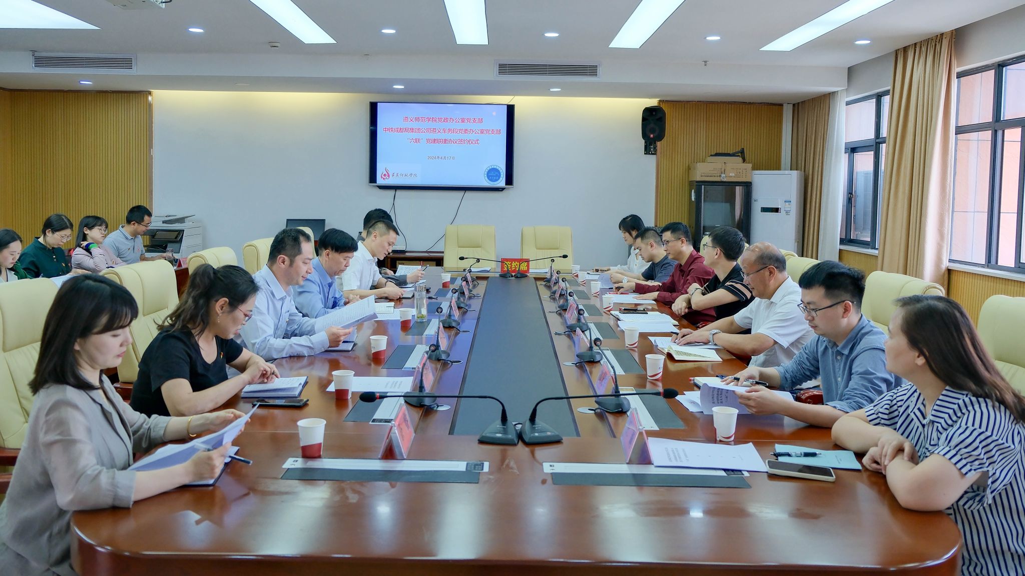 为贯彻落实新时代党的建设总要求,坚持内外联动、互融互通,打造学习型、服务型、创新型党组织,将党建优势转化为发展优势,助力学校高质量发展,4月17日下午,beat365亚洲版官网党政办公室党支部携手中国铁路成都局集团有限公司遵义车务段党委办公室党支部联合开展党建联建活动。