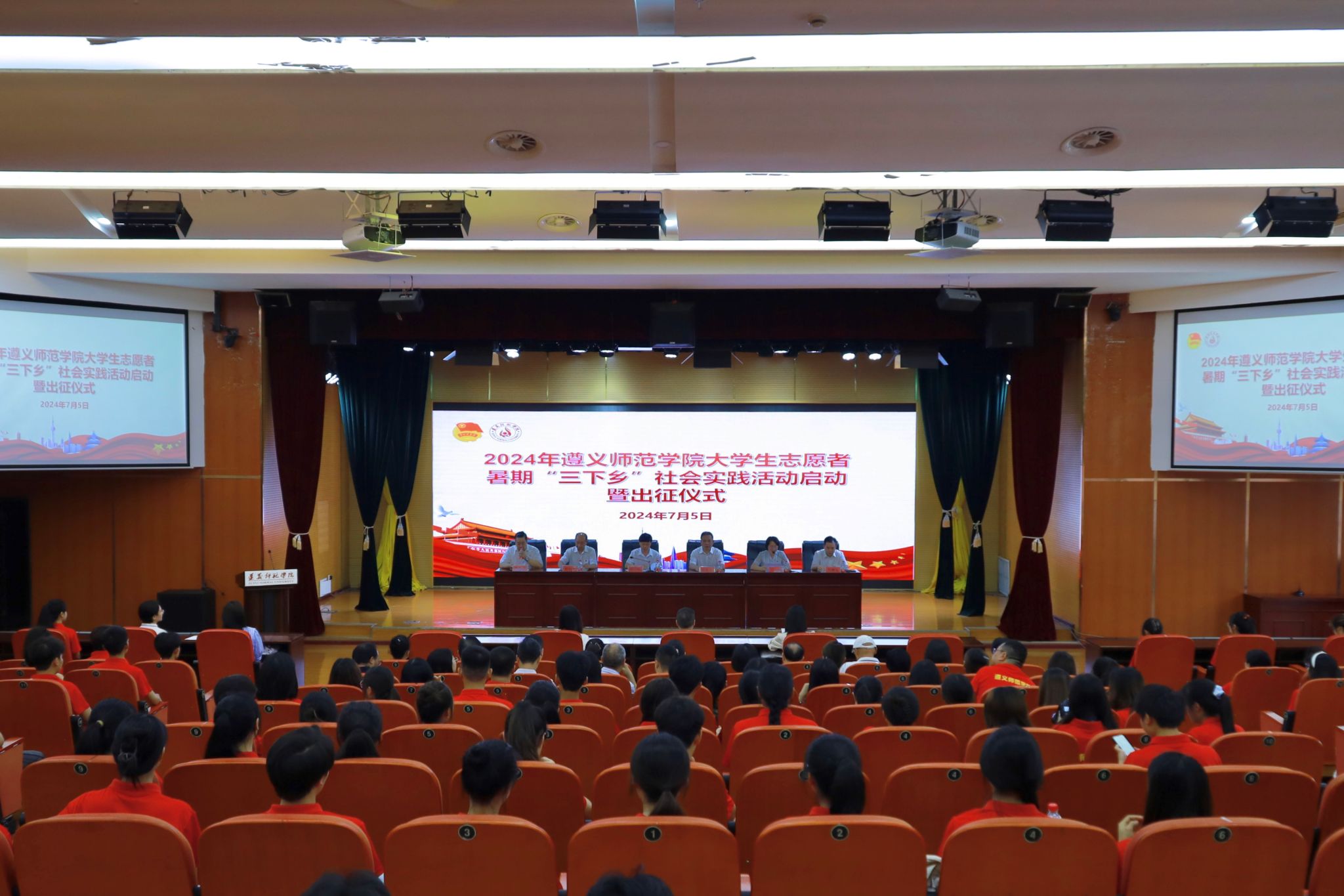 本网讯(文、图/团委) 7月5日上午,beat365亚洲版官网2024年大学生志愿者暑期“三下乡”社会实践活动启动暨出征仪式在学术报告厅举行。党委书记陈治松,党委副书记、校长刘肇军,党委副书记曾伯平、江山,党委委员、副校长胡贵勇、肖仲久,相关职能部门主要负责人,各二级学院党委(党总支)副书记、团总支主要负责人,实践服务队指导教师、队员等200余人参加仪式。仪式由江山主持。