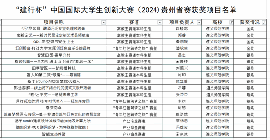 获得省级金奖的团队分别是化学化工学院“‘污’尽其用——酿酒污泥处理专业领跑者”团队、音乐与舞蹈学院“红创黔音-打造大学生原创红色音乐公益品牌”团队、教师教育学院“虫新定艺——新时代昆虫定制艺术品领航者”团队、物理与电子科学学院“QDs-新型燃气安全卫士”团队。