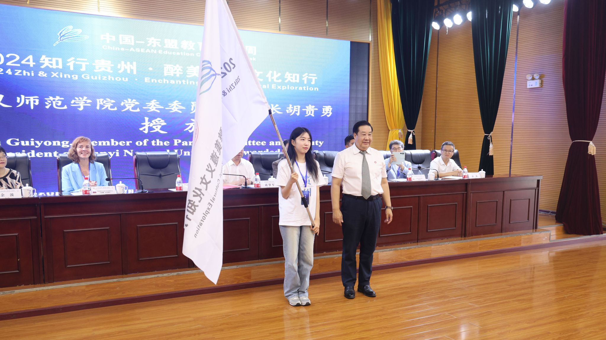 beat365亚洲版官网党委委员、副校长胡贵勇向学生代表授旗。
