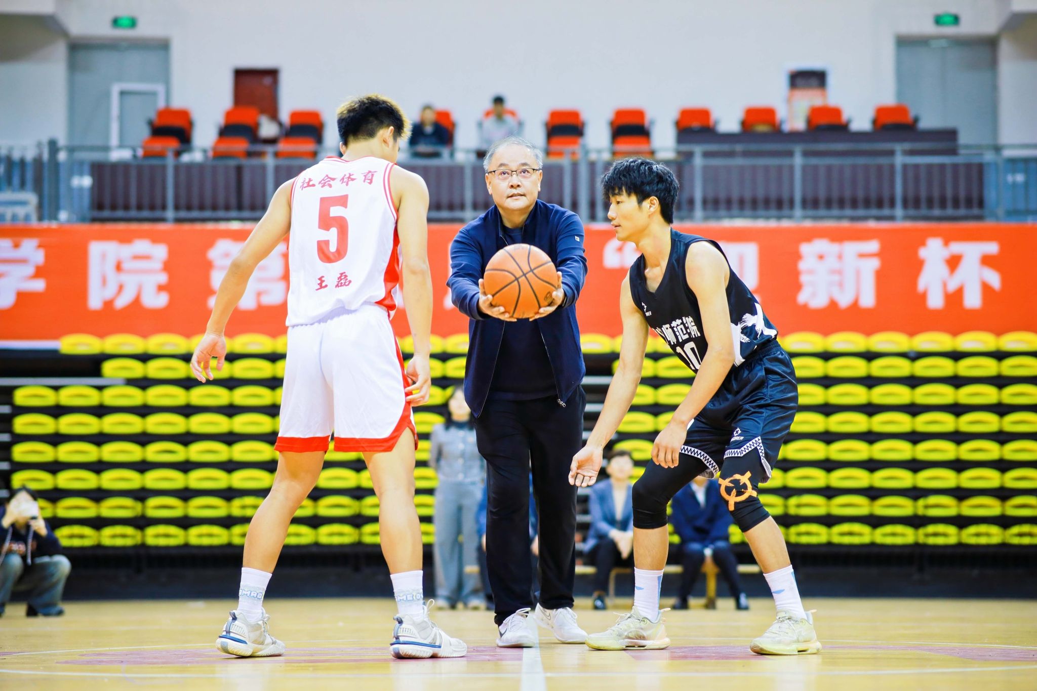 大赛仲裁委员会主任、体育学院院长谭黔为本届篮球联赛首场比赛开球。