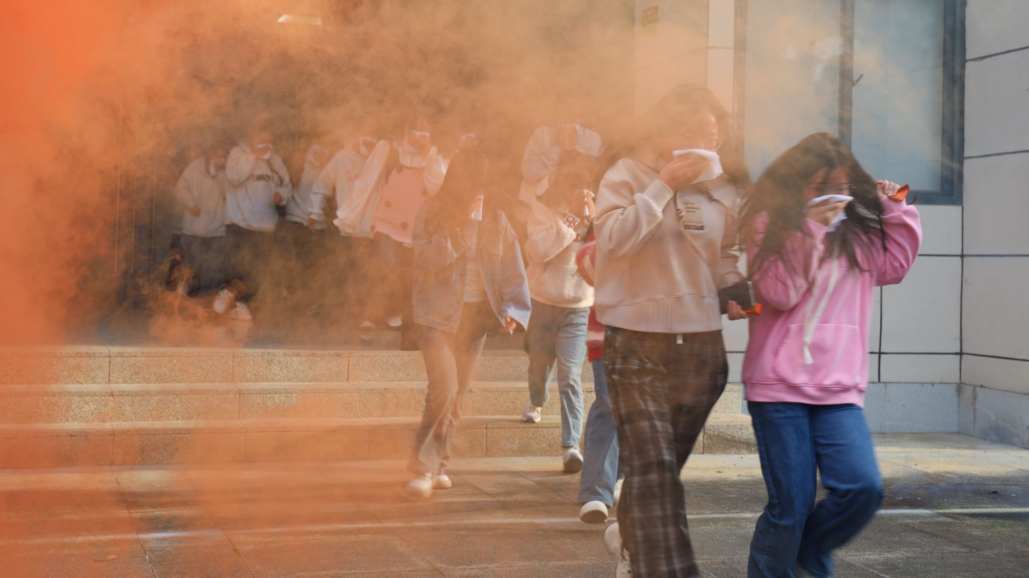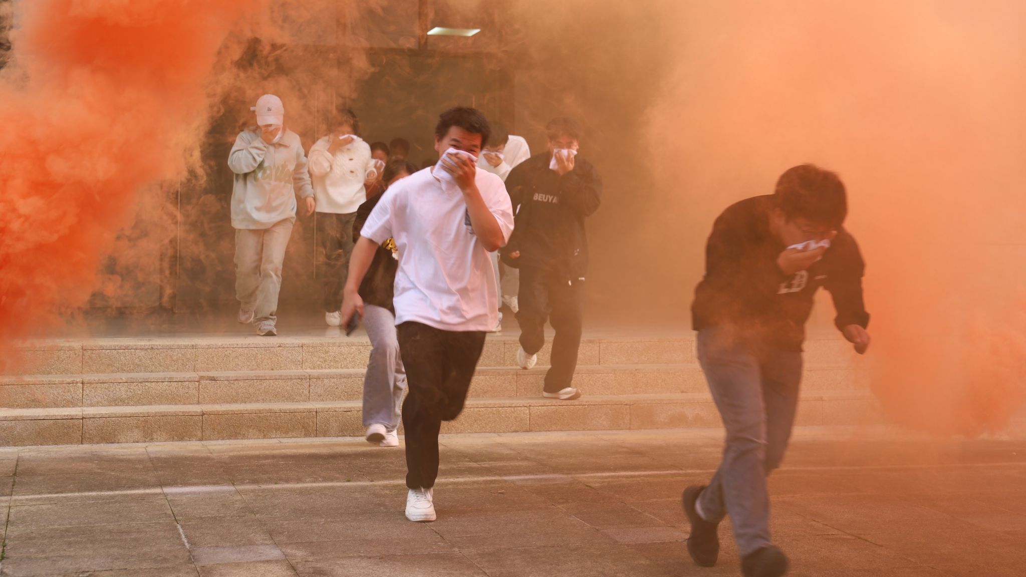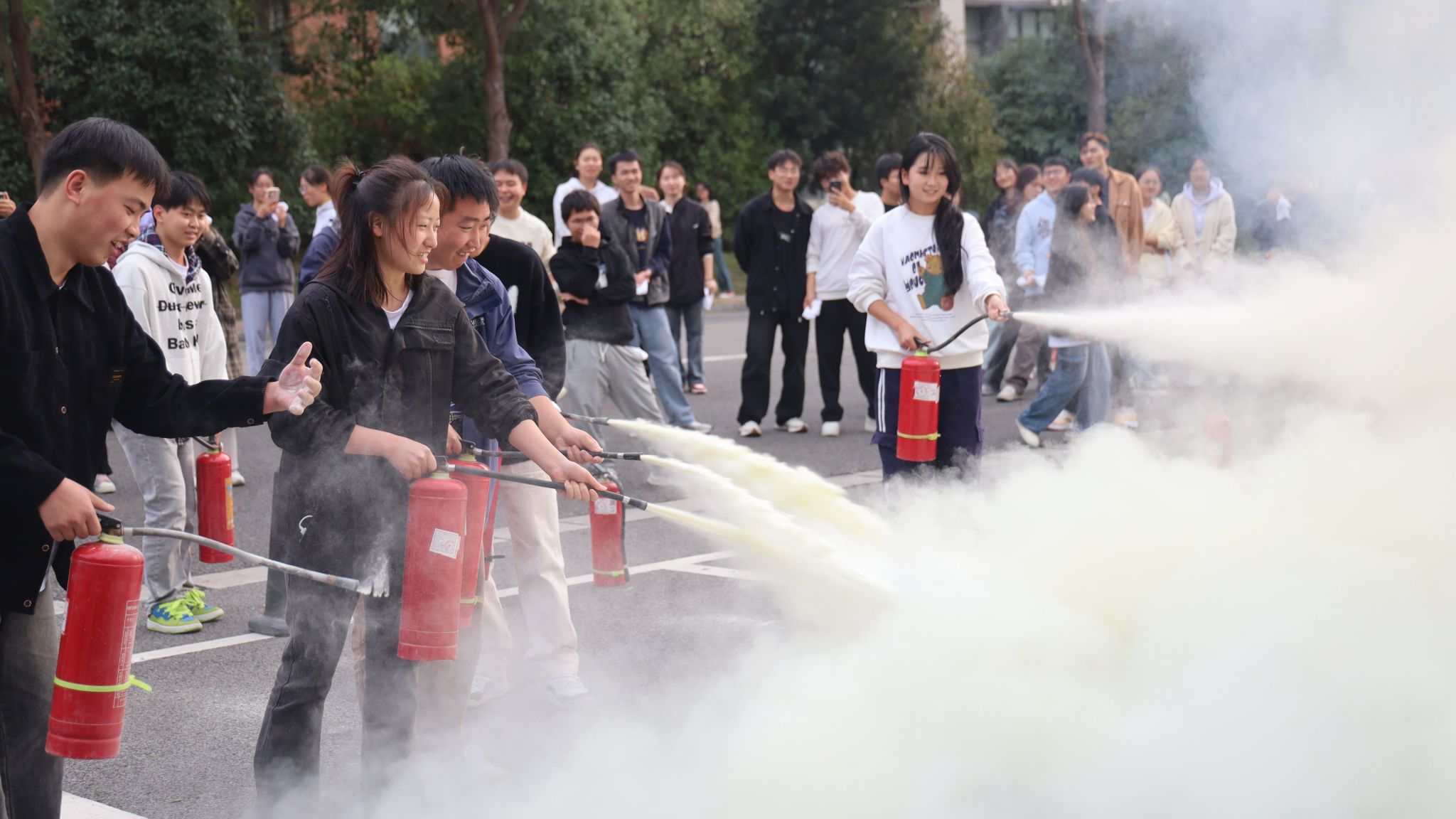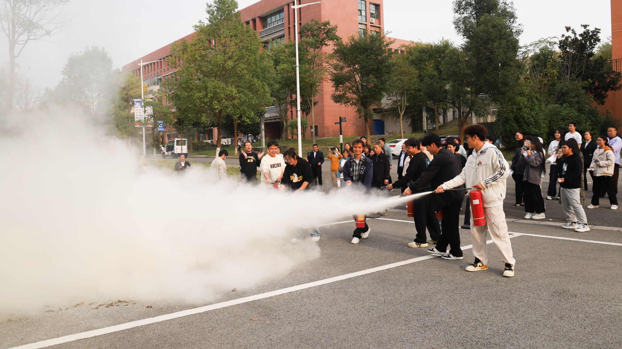 在消防安全培训演练中,师生积极参与使用灭火器进行灭火演练。