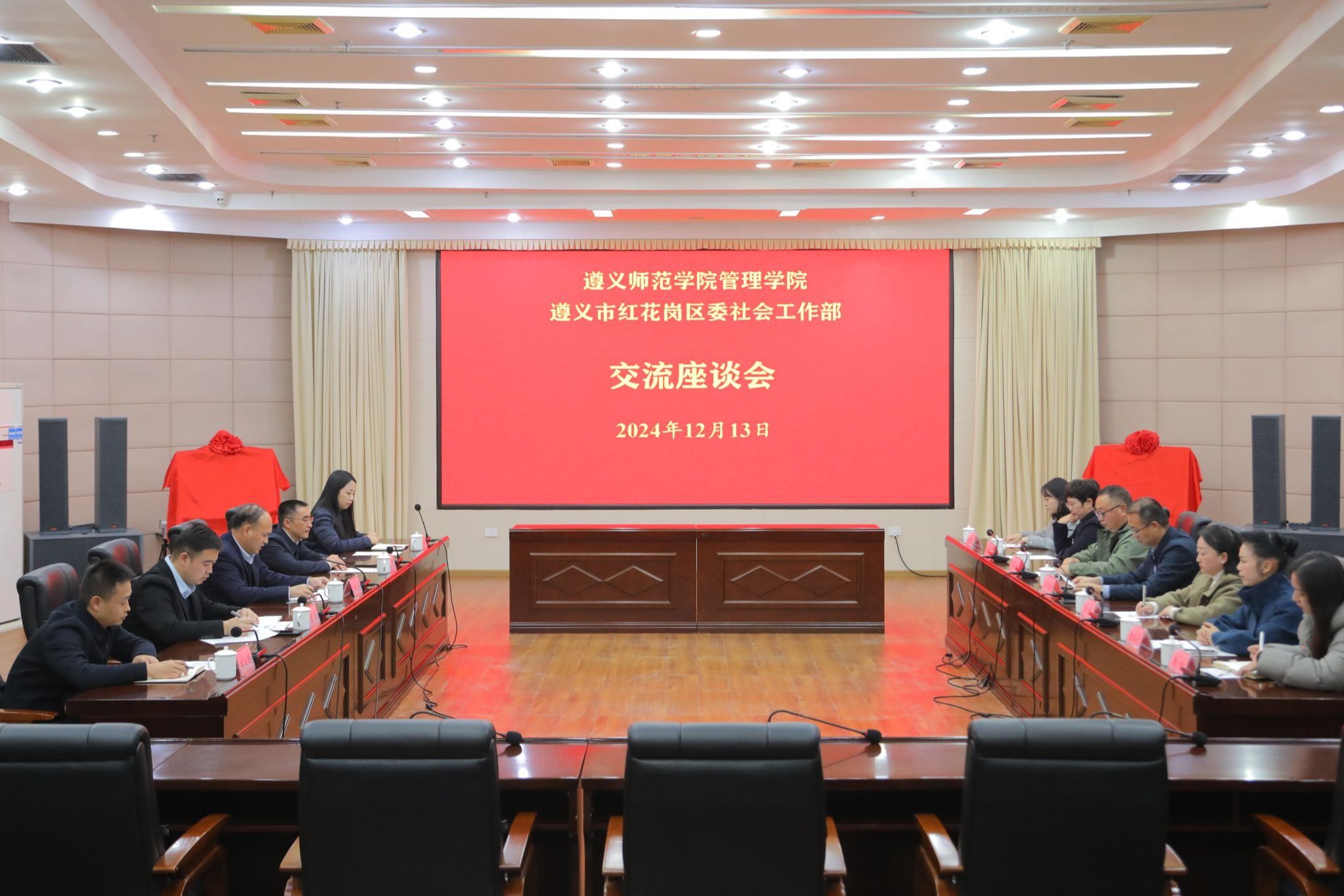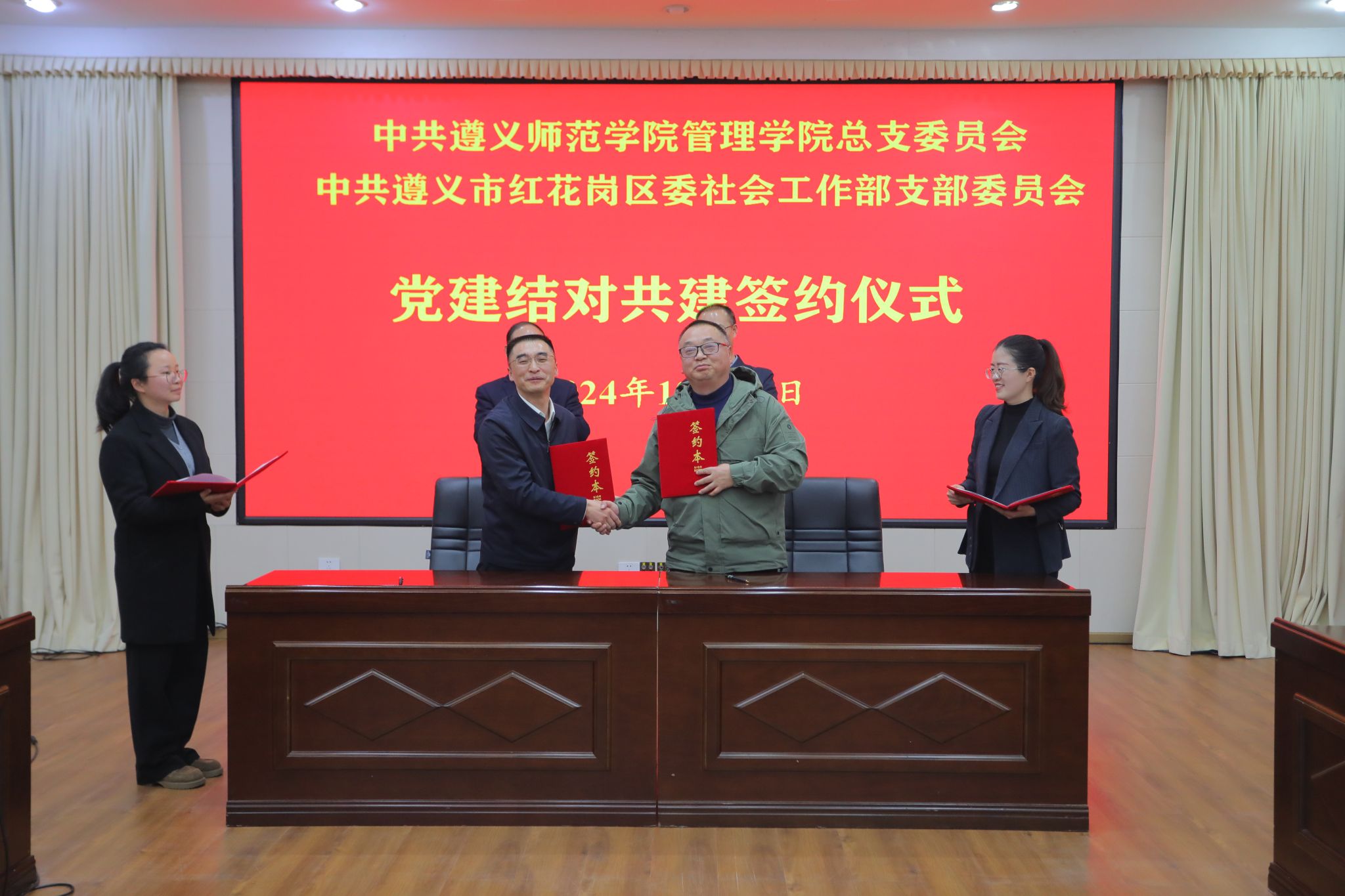 本网讯(文、图/管理学院) 12月13日下午,beat365亚洲版官网管理学院与红花岗区委社会工作部举行校部合作签约仪式,并为共建“beat365亚洲版官网管理学院社会工作人才实践基地”“遵义市红花岗区社会工作人才培训基地”揭牌。beat365亚洲版官网党委委员、副校长刘衍民,管理学院班子及部分教师,招生与毕业生就业指导处负责人,红花岗区委副书记邓小华,区委社会工作部部长、区委两新工委书记王飞等出席仪式。