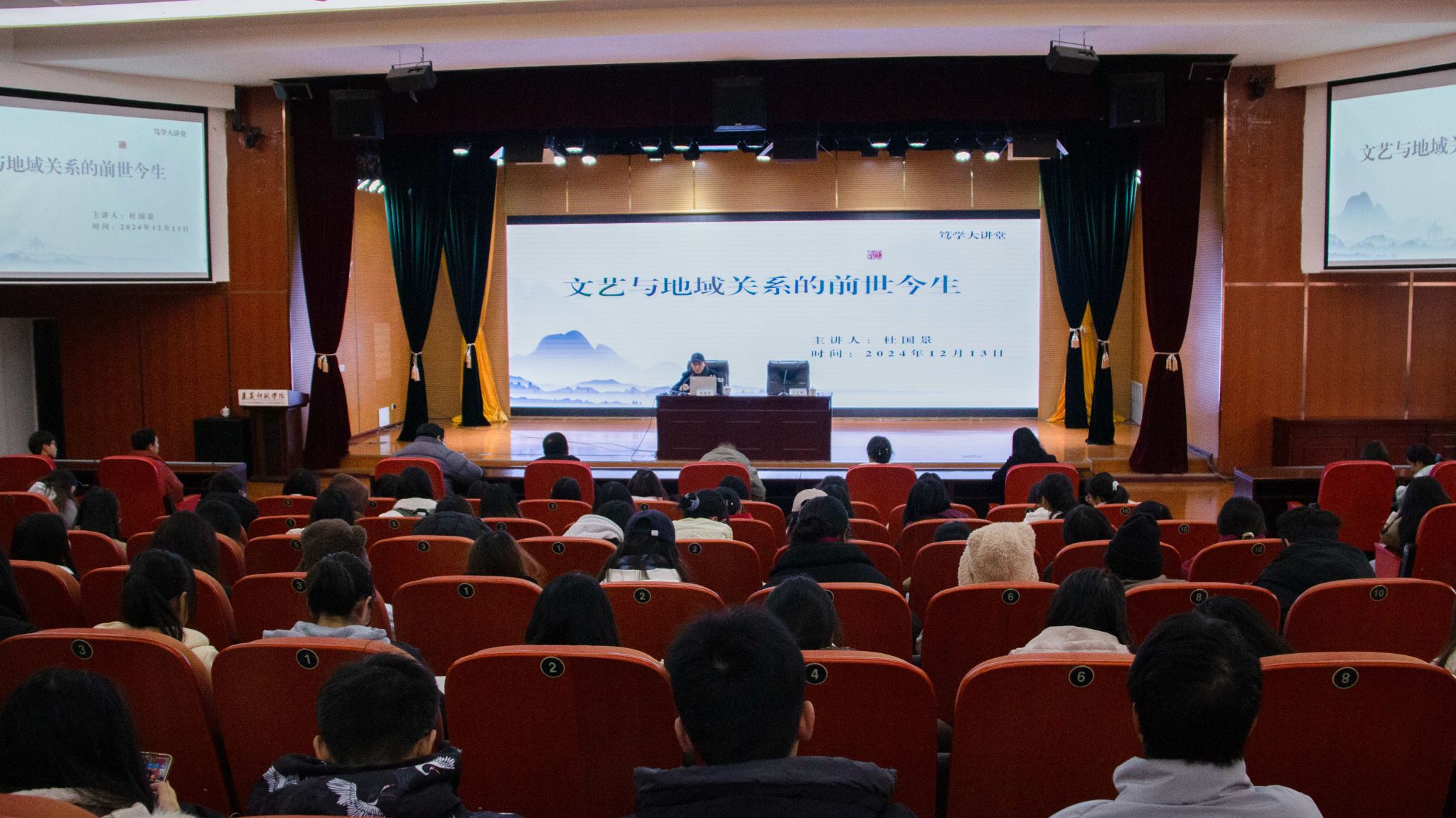本网讯(文/黄思妍 图/石文献) 12月13日上午,贵州民族大学二级教授、贵州省文艺评论家协会原主席杜国景应邀到beat365亚洲版官网作题为《文艺与地域关系的前世今生》的讲座,师生代表到场聆听。