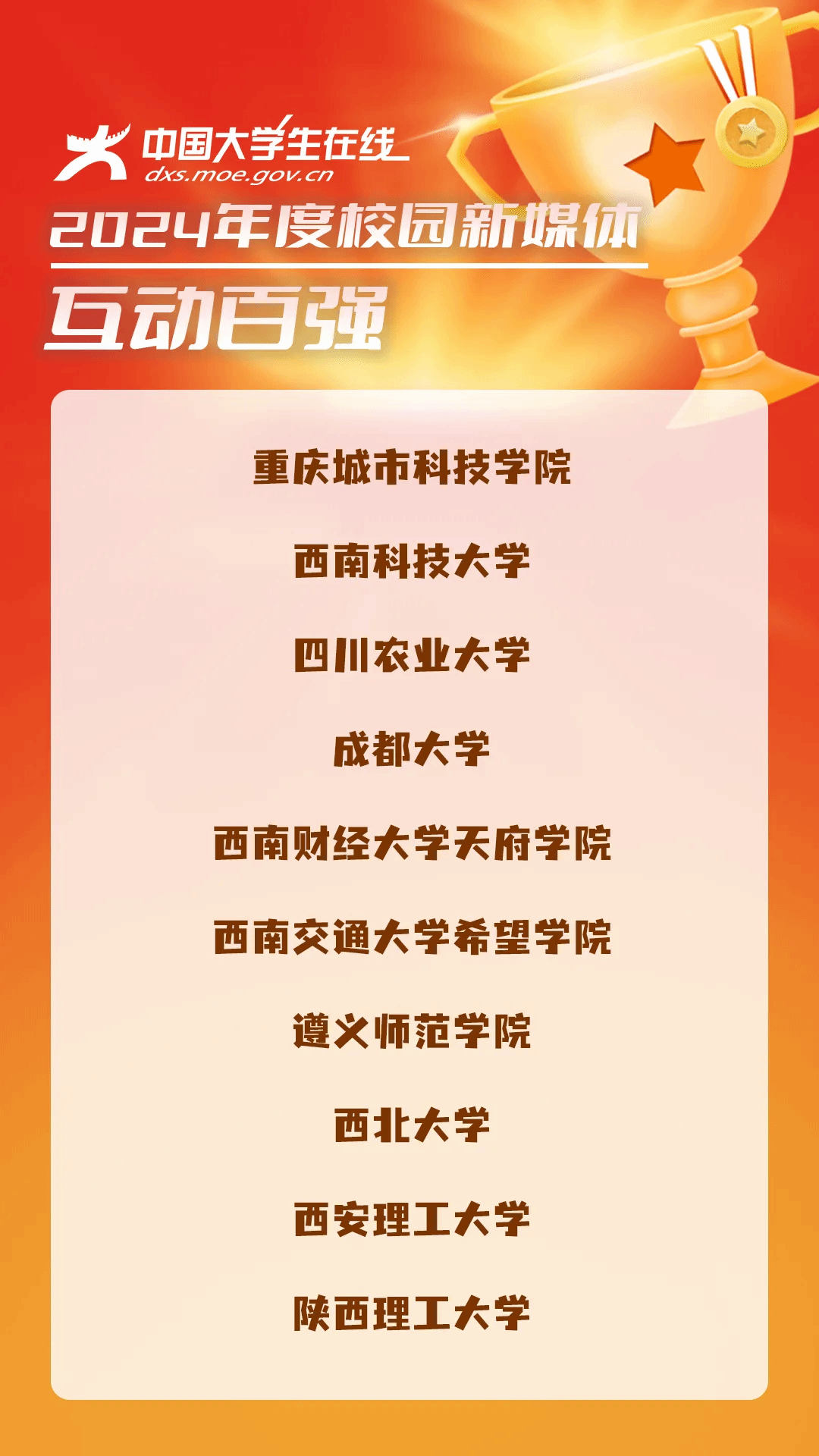 本网讯(施宣) 12月26日,教育部中国大学生在线公布2024年度校园新媒体表彰名单,beat365亚洲版官网入选“校园新媒体互动百强”(贵州仅1所高校入选)。这是学校第三次入选年度“校园新媒体互动百强”。