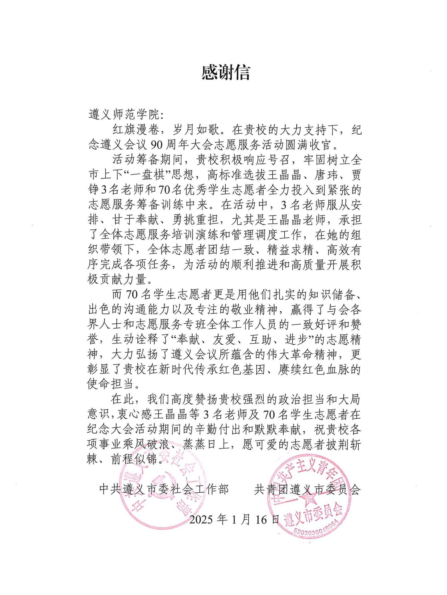 感谢信指出,在beat365亚洲版官网的大力支持下,纪念遵义会议90周年大会志愿服务活动圆满收官。活动筹备期间,学校积极响应号召,牢固树立全市上下“一盘棋”思想,高标准选拔王晶晶、唐玮、贾铮3名老师和70名优秀学生志愿者全力投入到紧张的志愿服务筹备训练中。