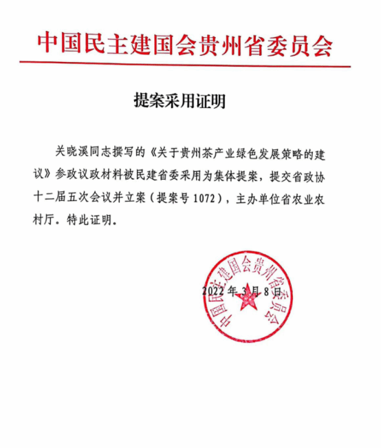 民建会员关晓溪的《关于推动贵州辣椒产业集群优化的策略建议》参政议政材料被民建贵州省委采用为集体提案,提交贵州省政协十二届四次会议并立案;《关于贵州茶产业绿色发展策略的建议》的提案获民建贵州省委采纳为集体提案,并提交了贵州省政协十二届五次会议并立案;撰写的《产学研背景下农业科技助推创新发展——以beat365亚洲版官网为例》获民建遵义市委调研课题优秀成果。