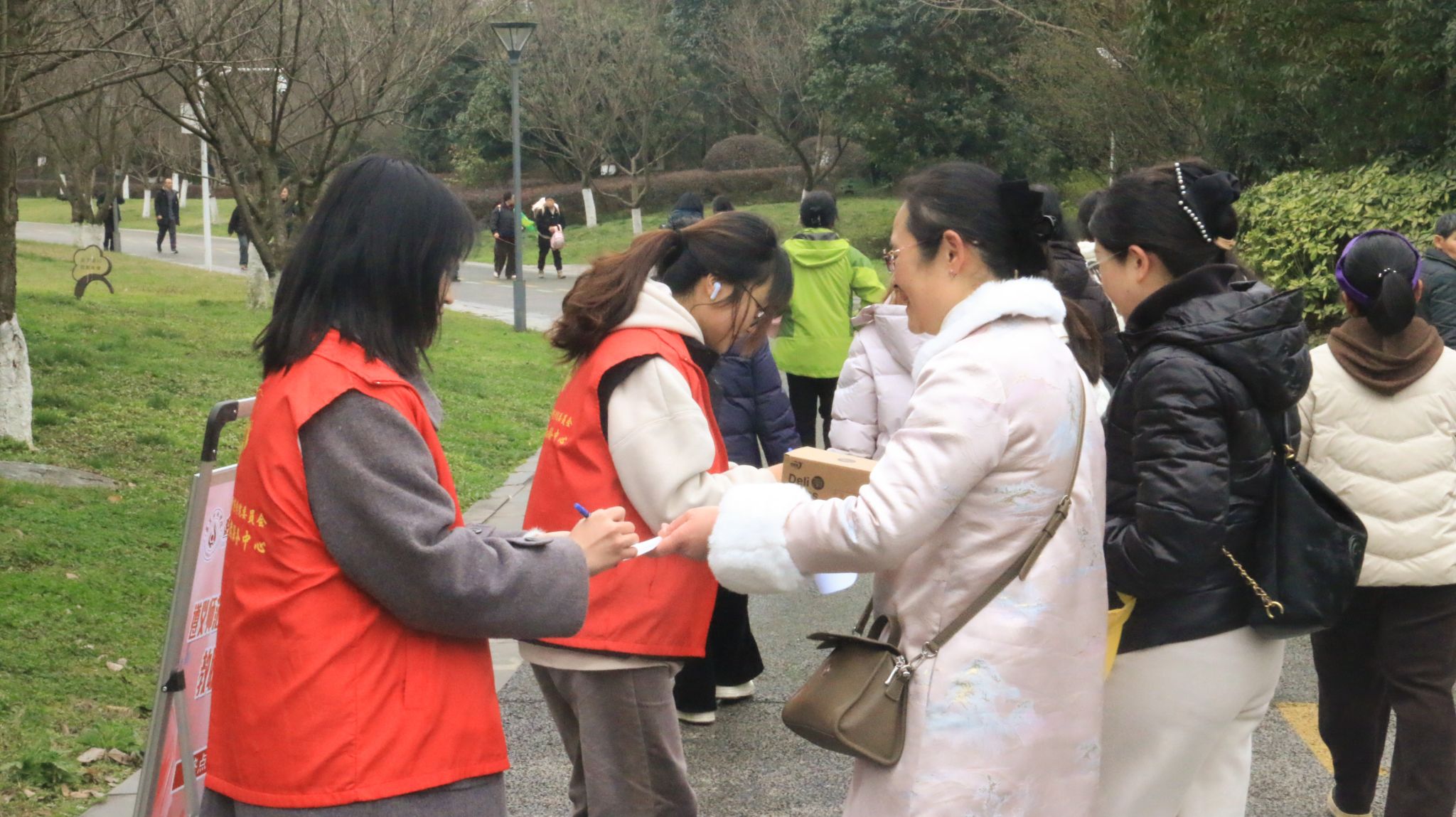 在公园徒步的过程中,女教职工们边闲聊趣事,边欣赏风景,途中一草一木,争先开放的娇艳梅花,湖中的天鹅,都在述说着春天的来临。整个游园过程,共设置两个打卡点,女教职工们凭借兑换券兑换纪念品,并拍照留念,定格美好瞬间。