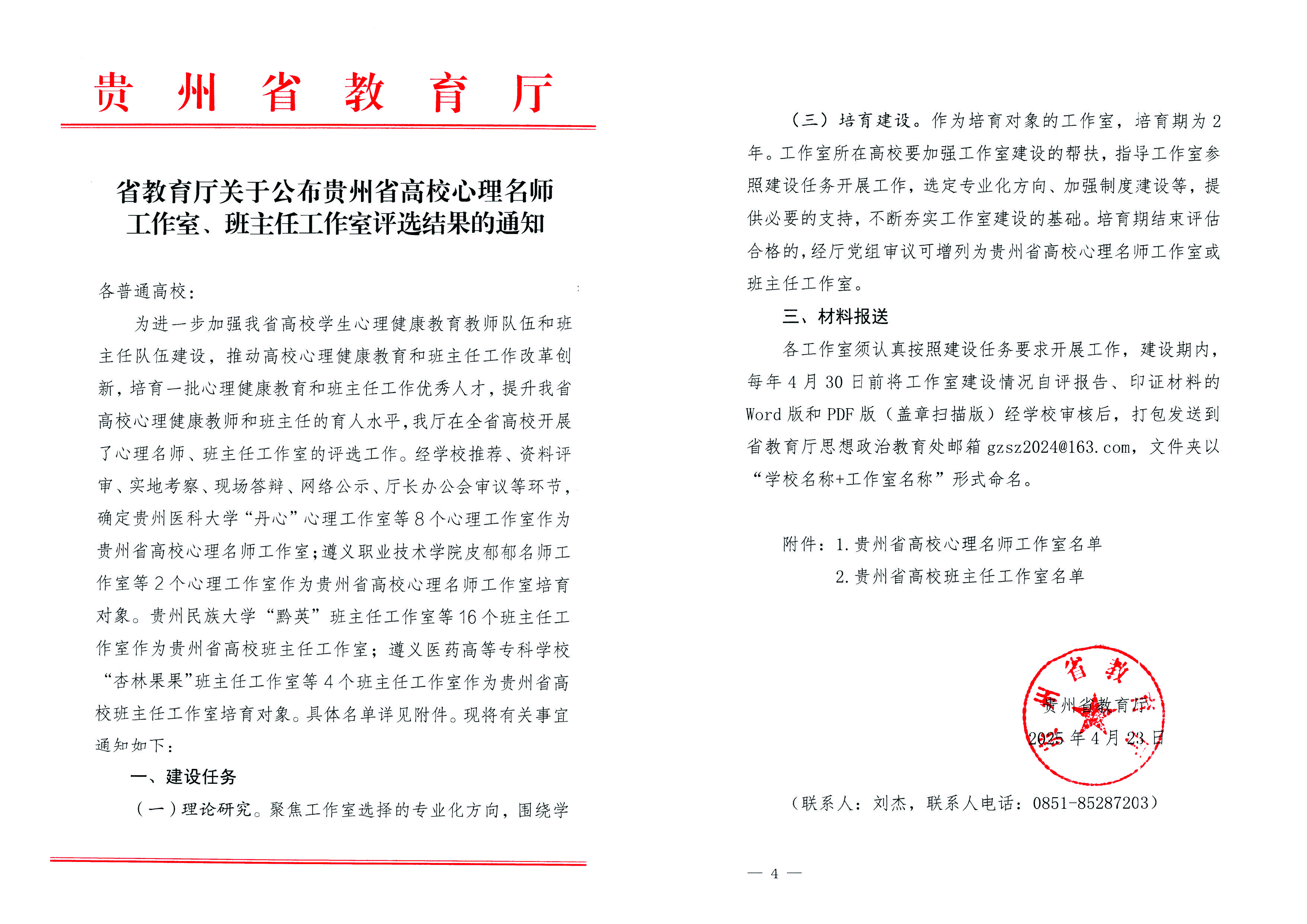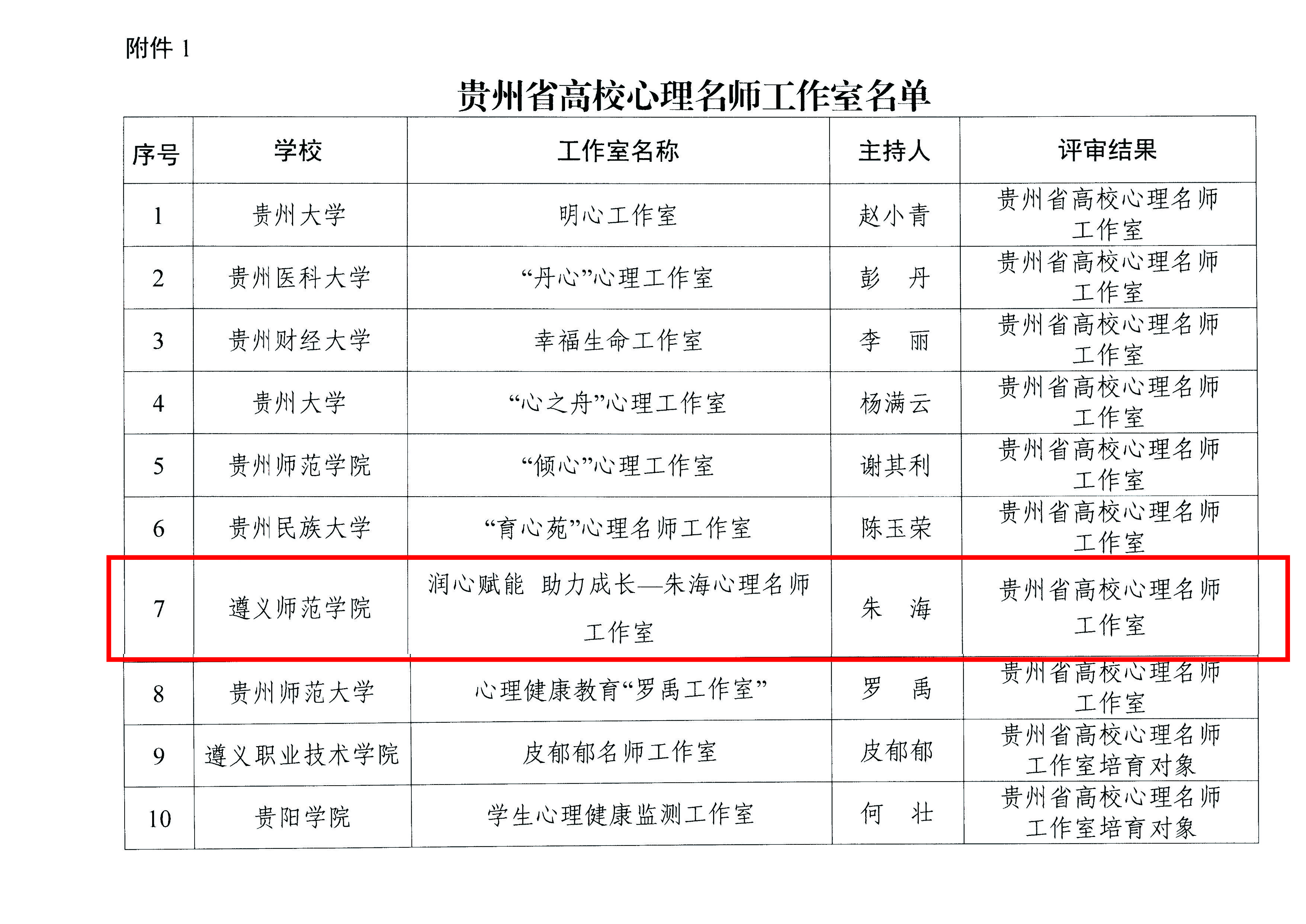 本网讯(心理健康与咨询中心)近日,贵州省教育厅印发《省教育厅关于公布贵州省高校心理名师工作室、班主任工作室评选结果的通知》,beat365亚洲版官网“润心赋能 助力成长—朱海心理名师工作室”成功获批贵州省高校心理名师工作室。这是beat365心理健康教育工作的又一重要突破,彰显了beat365在心理育人领域的持续深耕与创新引领。