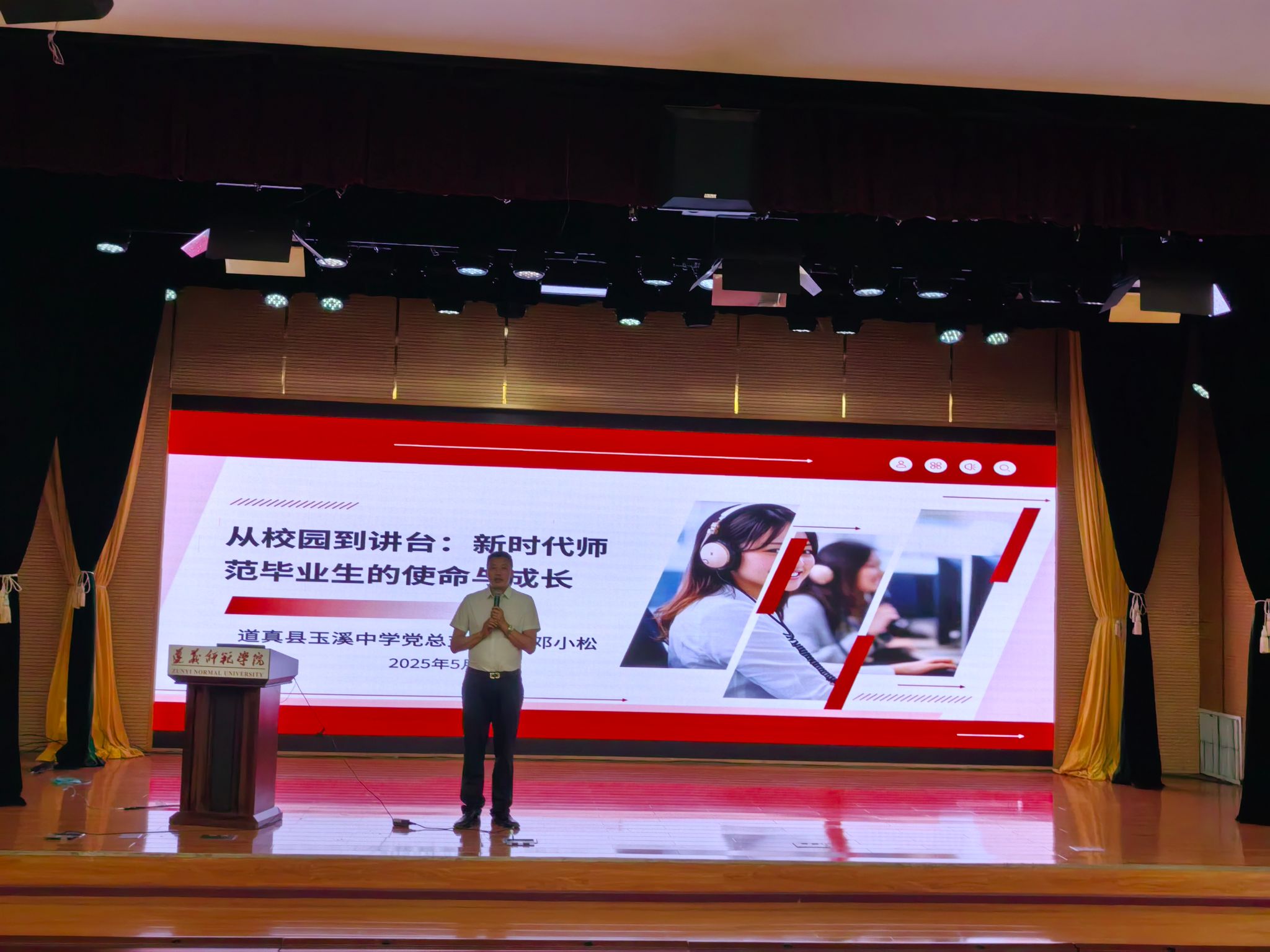 道真自治县玉溪中学党总支书记、校长邓小松,围绕“新时代师范毕业生的使命与成长”这一主题,结合自己丰富的中学教学与管理经验,从职业能力、国家政策等方面为beat365亚洲版官网师范类专业学生描绘了新时代教师画像、使命和前景,帮助学生加深对当今基础教育特别是乡村教育的认识,明确新时代教师的职业能力体系,具有很强的实践指导意义。
