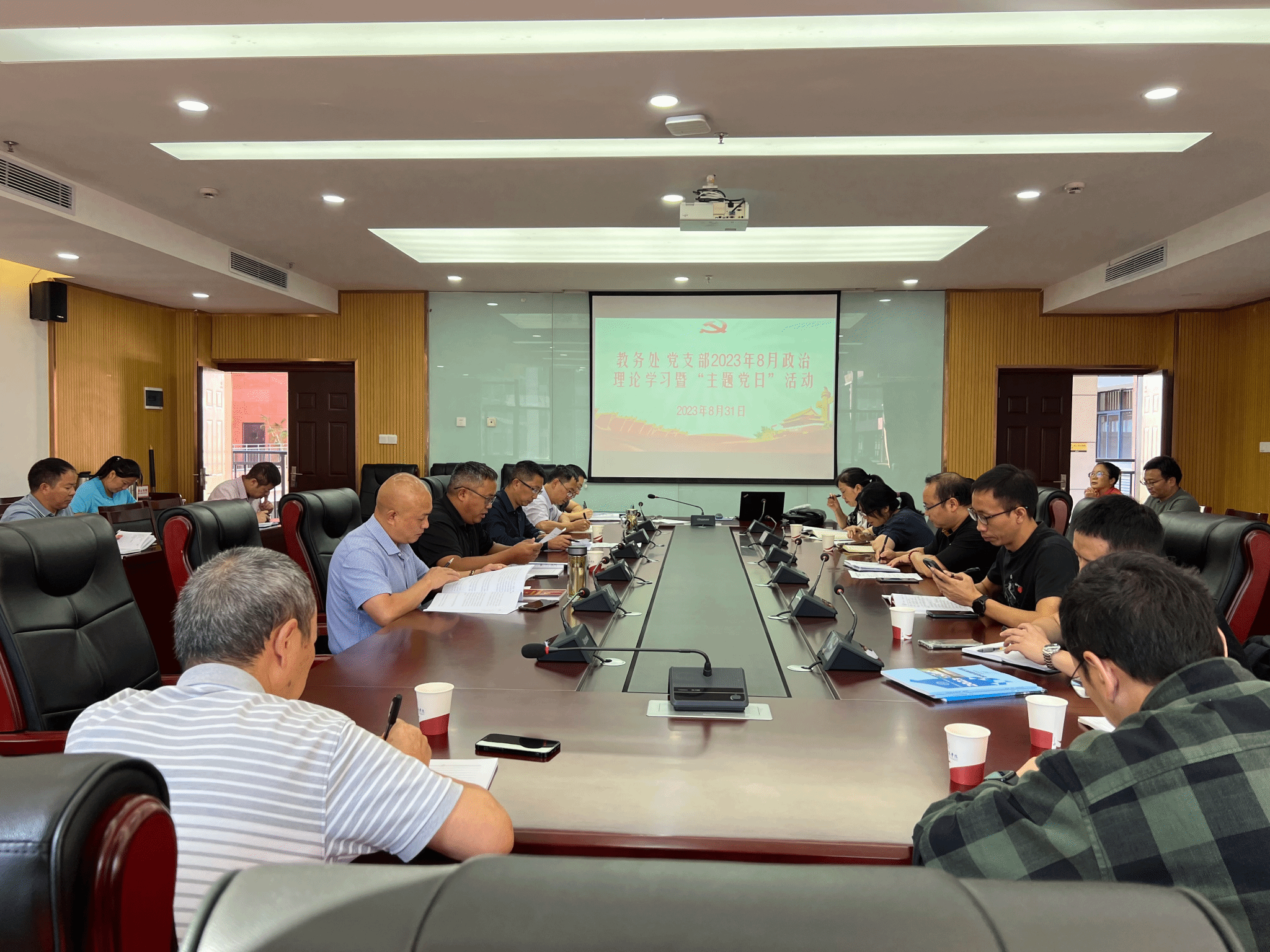 为深入学习习近平新时代中国特色社会主义思想和党的二十大精神,加强教职工法治教育,2023年8月31日上午,教务处党支部在行政楼322会议室,开展主题党日活动、政治理论学习、教职工法治教育。教务处党支部书记吴波主持会议,教务处全体党员参加会议。