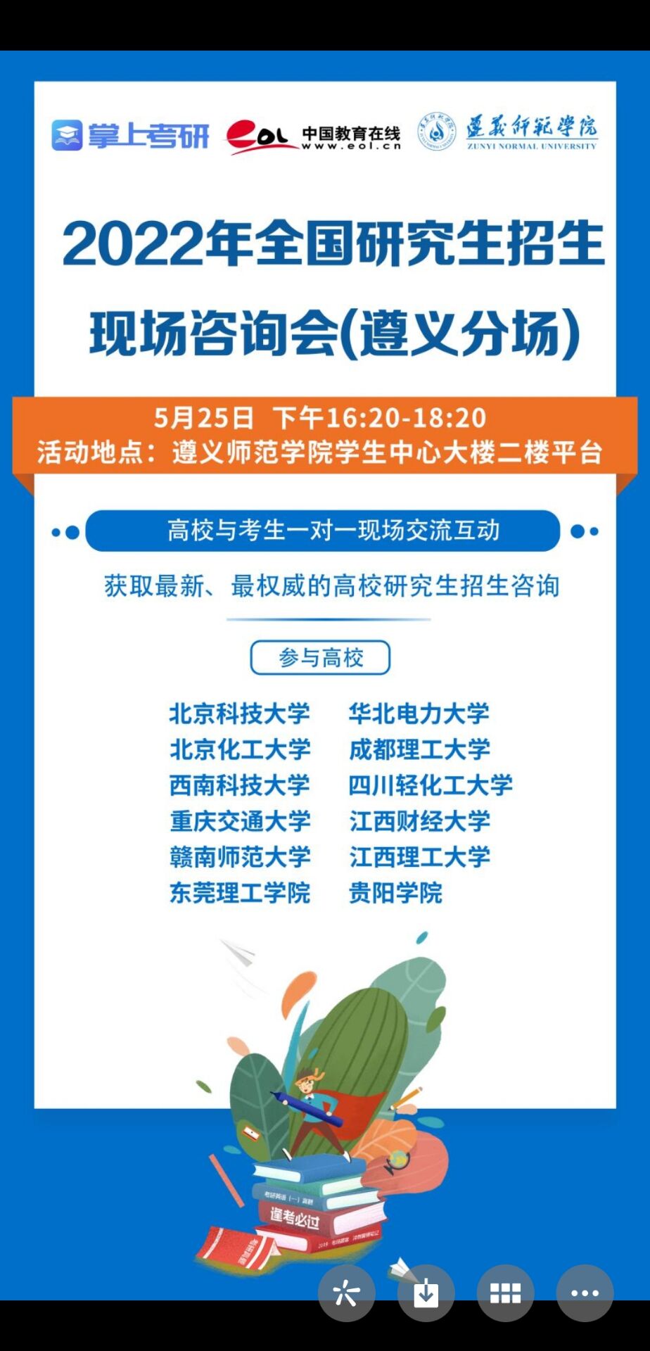 另外,beat365还在招聘会后于16:20-18:20在同一地点举办了2022年全国研究生招生现场咨询会(遵义分场)。参与高校共计11家,到会学生400余人。