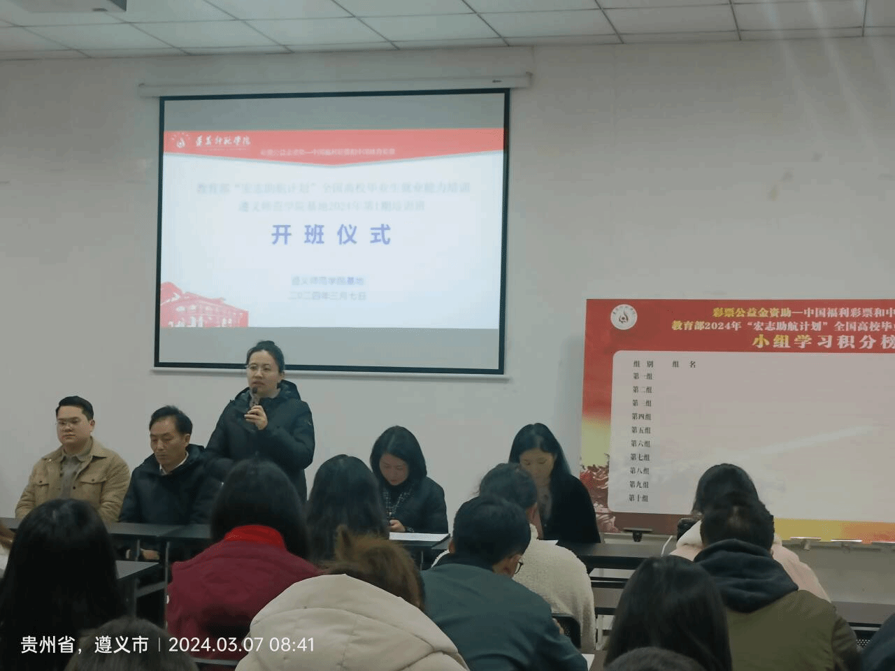 beat365亚洲版官网全国高校毕业生就业能力培训基地2024年第一期培训班于3月7日上午在遵义医科大学学生中心举行开班仪式。beat365亚洲版官网人文与传媒学院副书记刘世友发表动员讲话,beat365亚洲版官网招就处副处长罗洋介绍“宏志助航计划”培训基本情况,培训班班主任陈阳宣布培训期间班级管理规定。