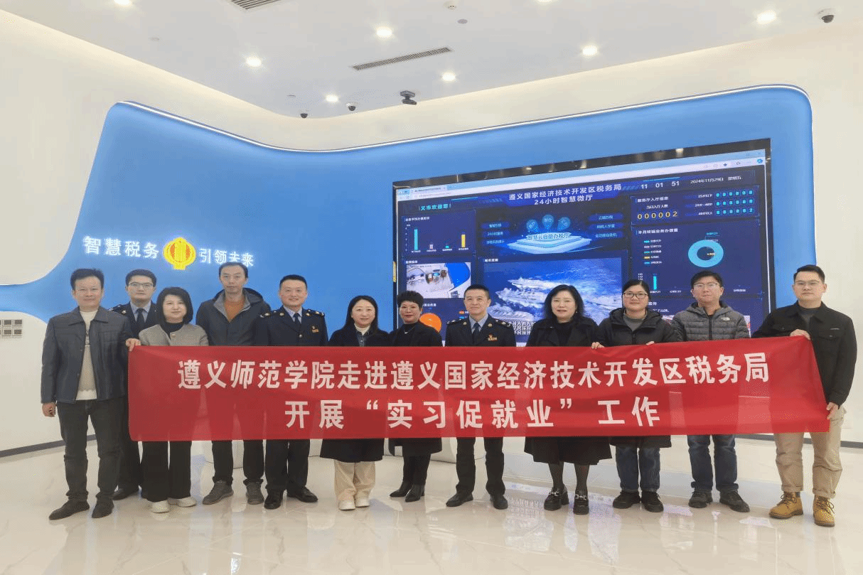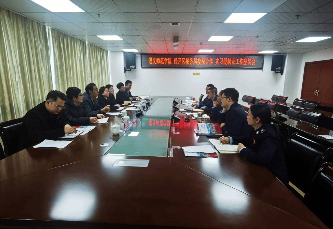 会上,遵义市国家经开区税务局党委委员、副局长张杰致欢迎词,遵义市国家经开区税务局党委委员、副局长李永生系统介绍了大学生的实习岗位设置、就业岗位的拓展等情况,相关科室负责人向我们介绍了实习岗位的具体工作内容、实习促就业的具体方案。双方围绕搭建“校税企生 多方共赢”过程中容易出现的重点、难点、堵点问题进行充分的沟通与交流。李静处长表示,我们双方要推动“校税合作 实习促就业”早日落地,希望经开区税务局能引荐更多的企业到beat365亚洲版官网招聘,协同推进beat365亚洲版官网毕业生高质量就业。