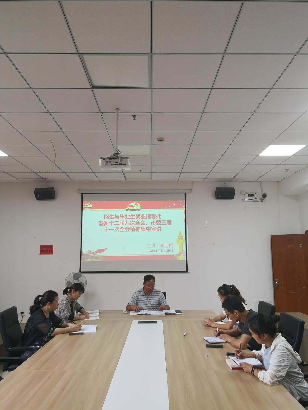 6月29日,招生与毕业生就业指导处党支部书记李明刚同志在学生中心419会议室宣讲省委十二届九次全会、市委五届十一次全会精神,招就处全体教职工参会。