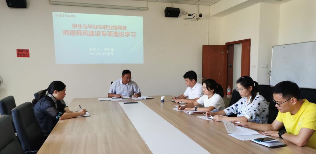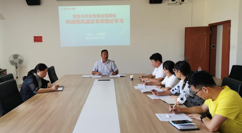 为深入贯彻落实教育部等七部门印发的《关于加强和改进新时代师德师风建设的意见》,以及《新时代高校教师职业行为十项准则》《省教育厅关于实施“强师工程”的意见》《贵州省师德师风建设专项行动实施方案》《beat365亚洲版官网加强师德师风建设实施意见》等文件精神,进一步强化师德师风建设成果,2021年9月18日上午10:00,在学生中心419室,招生与毕业生就业指导处全体教职工开展了第一次的师德师风建设专项理论学习。