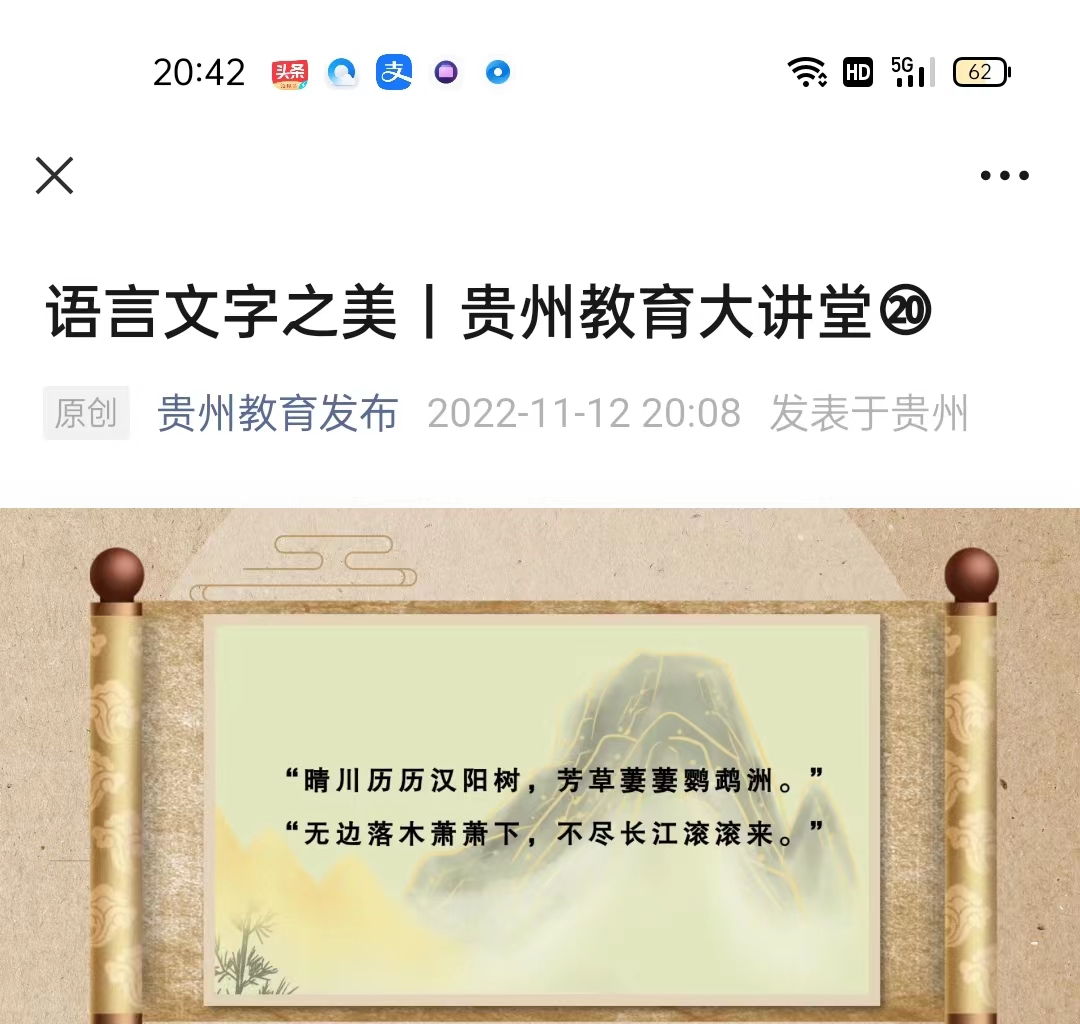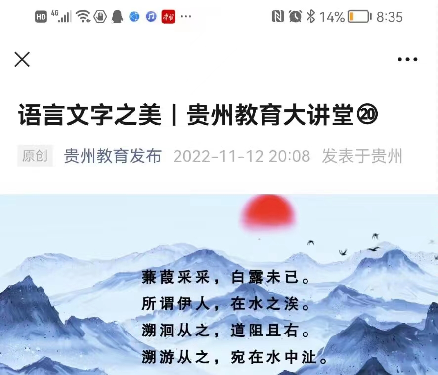 11月12日,离退休干部工作处全体同志通过电视直播、动静APP、动静贵州视频号、贵州教育发布微信公众号等形式观看了“贵州教育大讲堂”第二十期节目《语言文字之美》。
