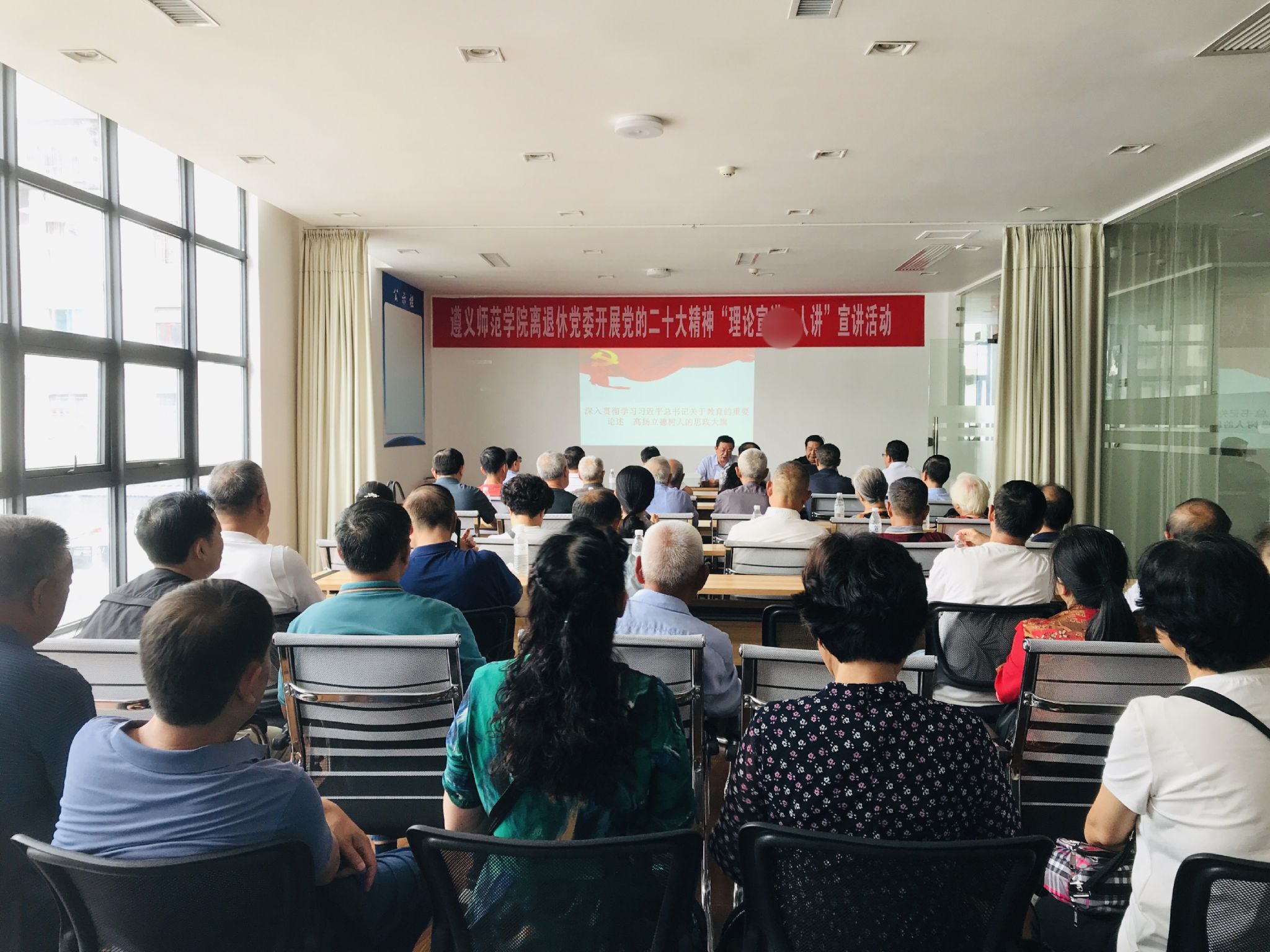 退休党员、离退休干部工作处全体党员、教职工参加宣讲活动。
