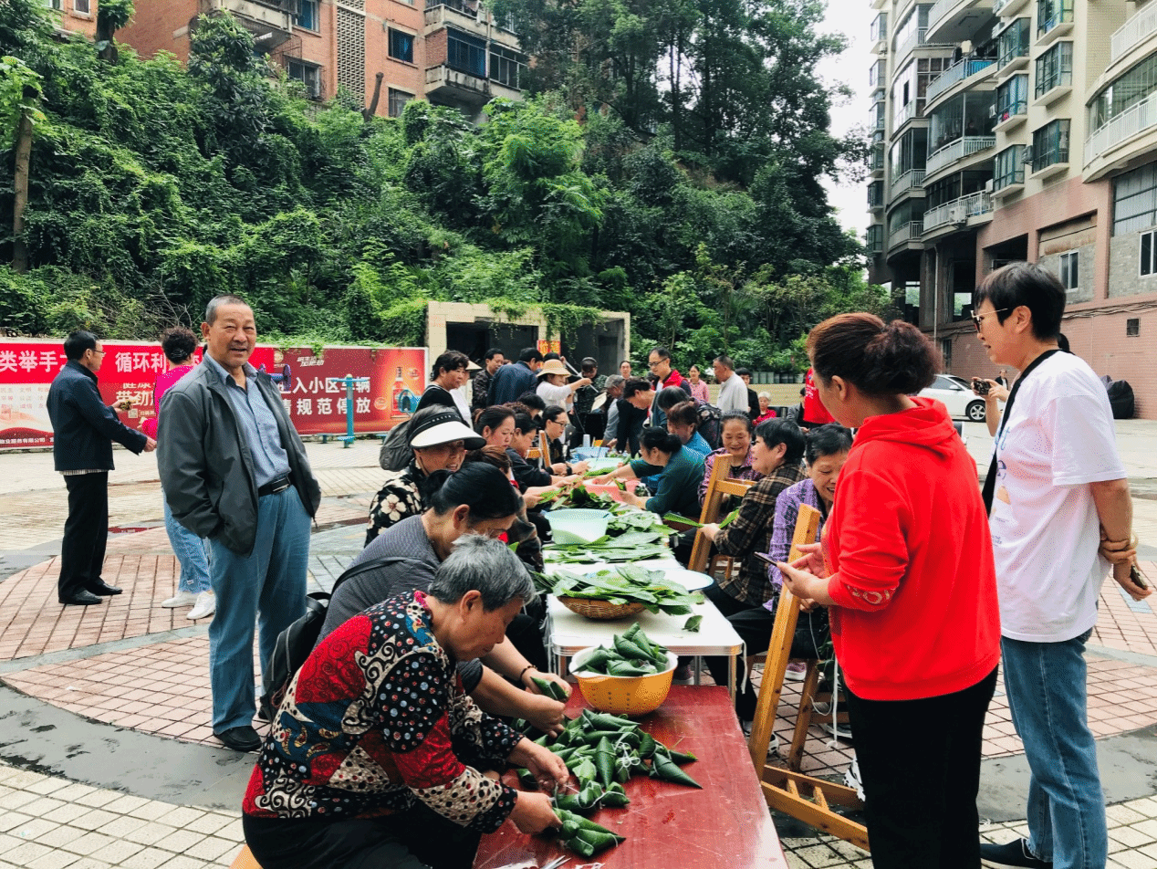 活动现场,党员和社区群众,有的搬桌子、有的抬凳子、有的拿糯米、有的取粽叶,大家有说有笑,兴高采烈,熟练地卷粽叶、做形状、填糯米、加馅料、扎捆线,互学互帮,一张张翠绿的粽叶在大家手中翩翩起舞,一个个有模有样、快速成型的粽子散发出淡淡清香。