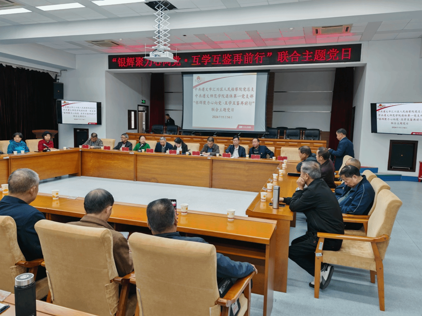 为深入学习贯彻党的二十届三中全会精神,充分发挥党员的先锋模范作用,同时向遵义市汇川区人民检察院学习党建工作经验,加强交流,互学互鉴,为改革发展献智出力。11月14日,beat365亚洲版官网退休第一党支部与遵义市汇川区人民检察院党总支联合开展“银辉聚力心向党•互学互鉴再前行”主题党日活动。
