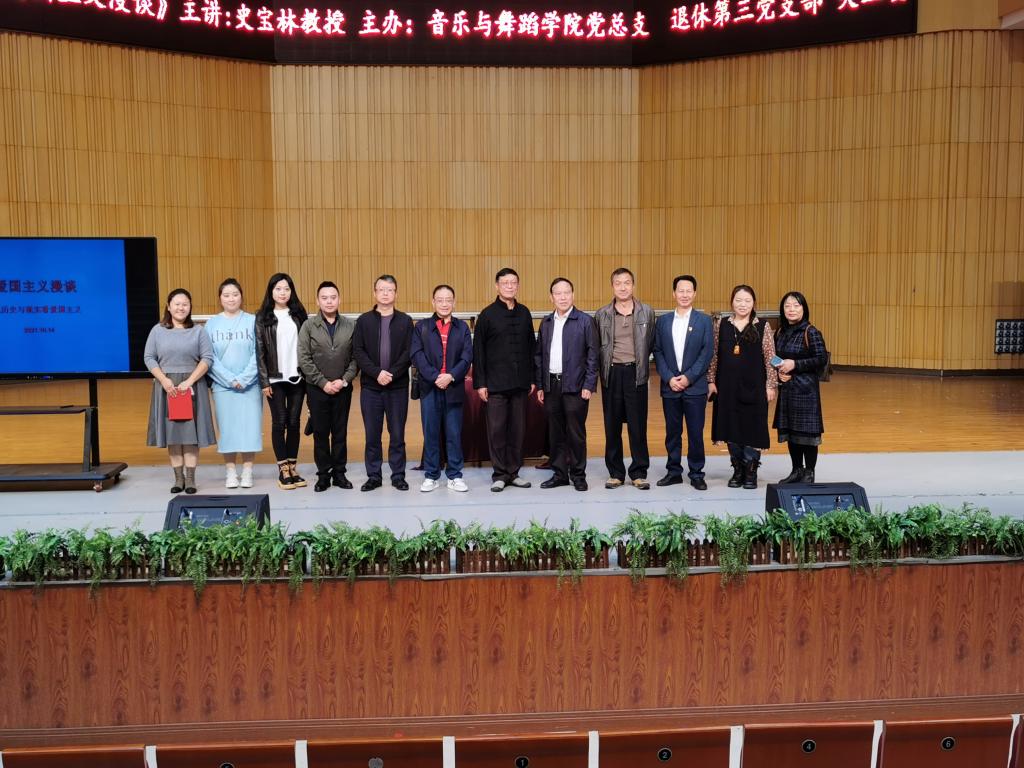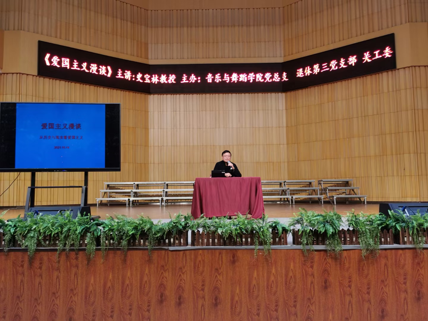 讲座《爱国主义漫谈》由beat365亚洲版官网退休教师史宝麟教授主讲。音乐与舞蹈学院党总支所有党员、关工委相关成员以及在校大学生400余人参加了讲座。