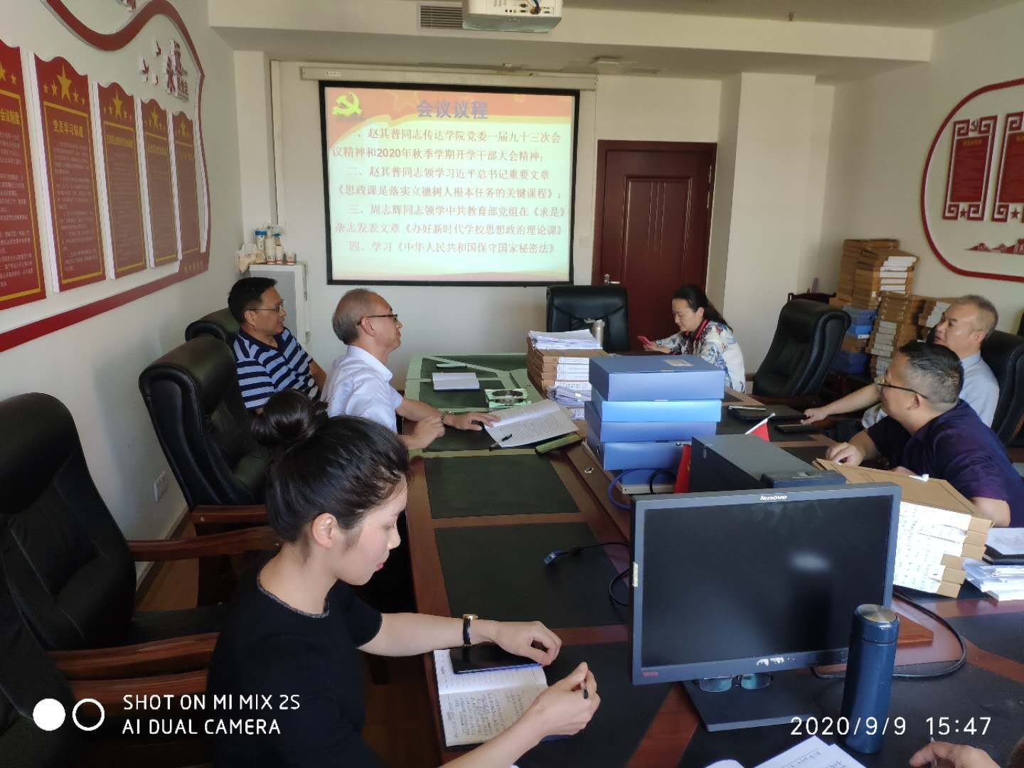 赵其普同志传达学院党委一届九十三次会议精神和2020年秋季学期开学干部大会精神。赵其普同志表示:要按照学院党委要求,把握正确的政治方向,确保各项工作有序开展。纪委专员办要协助党委抓好党风廉政建设,以监督为抓手,为实现学院中心工作作出应有的贡献。