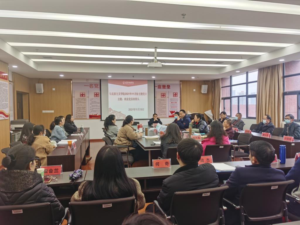 为深入推进党史学习教育,引导马克思主义学院全体党员教师用党的光荣传统和优良作风坚定信念、凝聚力量,用党的实践创造和历史经验启迪智慧、砥砺品格,我院于2021年11月19日下午15:00整,在执治楼503会议室开展了“我是党员我带头”主题党日。