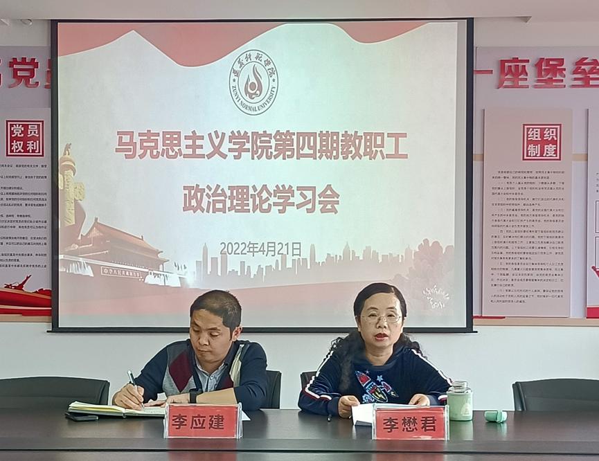 2022年4月22日下午,马克思主义学院在执治楼503会议室召开第四期教职工政治理论学习会。会议由党总支书记李应建主持,全体教职工参加。