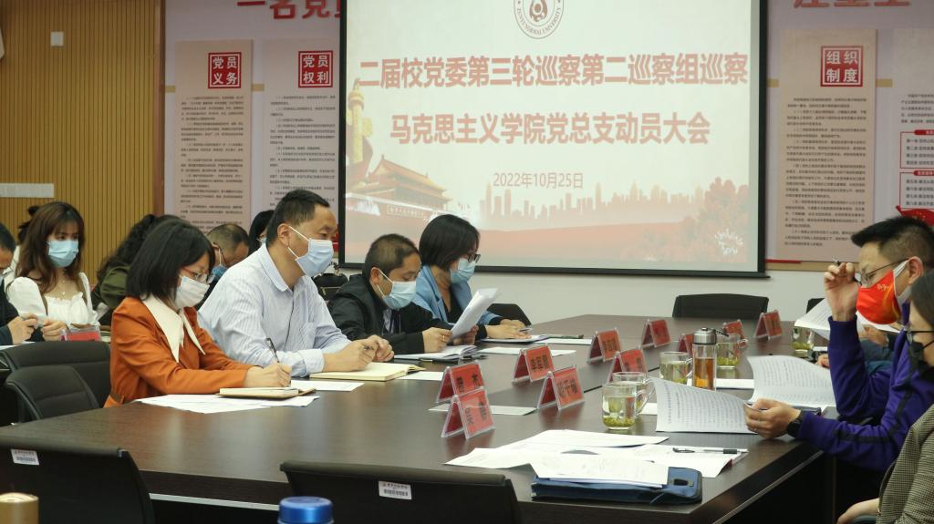 按照二届校党委第三轮校内巡察工作的统一部署和安排,第二巡察工作组近日进驻马克思主义学院开展巡察工作。10月25日下午,二届校党委第三轮巡察第二巡察工作组巡察马克思主义学院动员会在马克思主义学院会议室召开。巡察工作组组长唐德才同志作了讲话。巡察工作组副组长黄纲同志宣读了《中共beat365亚洲版官网委员会巡察小组关于对马克思主义学院及其党组织开展常规巡察的通知》。马克思主义学院党总支书记李应建同志作表态发言。二届校党委第三轮巡察第二巡察工作组副组长叶颖以及巡察工作组全体成员,马克思主义学院党总支副书记袁婧、副院长李军星、曾杰,科级以上干部、全体党员和教师代表等列席会议。