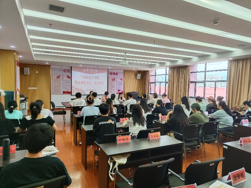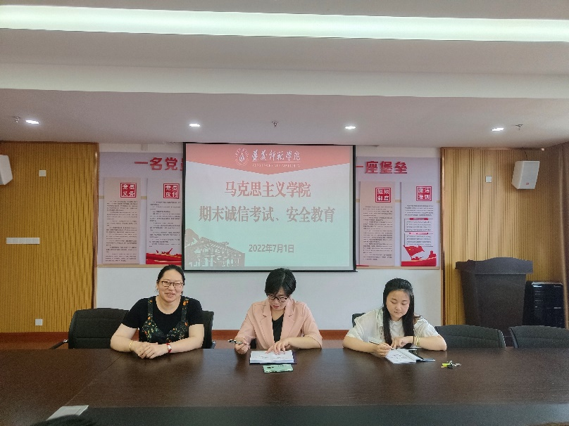 2022年7月1日上午,马克思主义学院党总支副书记袁婧老师、学生科副科长陈首君老师、楚艳辉老师,同19级、20级、21级各班长以及团支书、学生会20级、21级各部门负责人,召开以“诚信考试,安全教育”为主题的学生干部大会,旨在教导马院学子诚信考试,以诚为本,叮嘱同学们暑假期间注意自身安全,用积极的态度,饱满的热情来充实自己的假期生活。